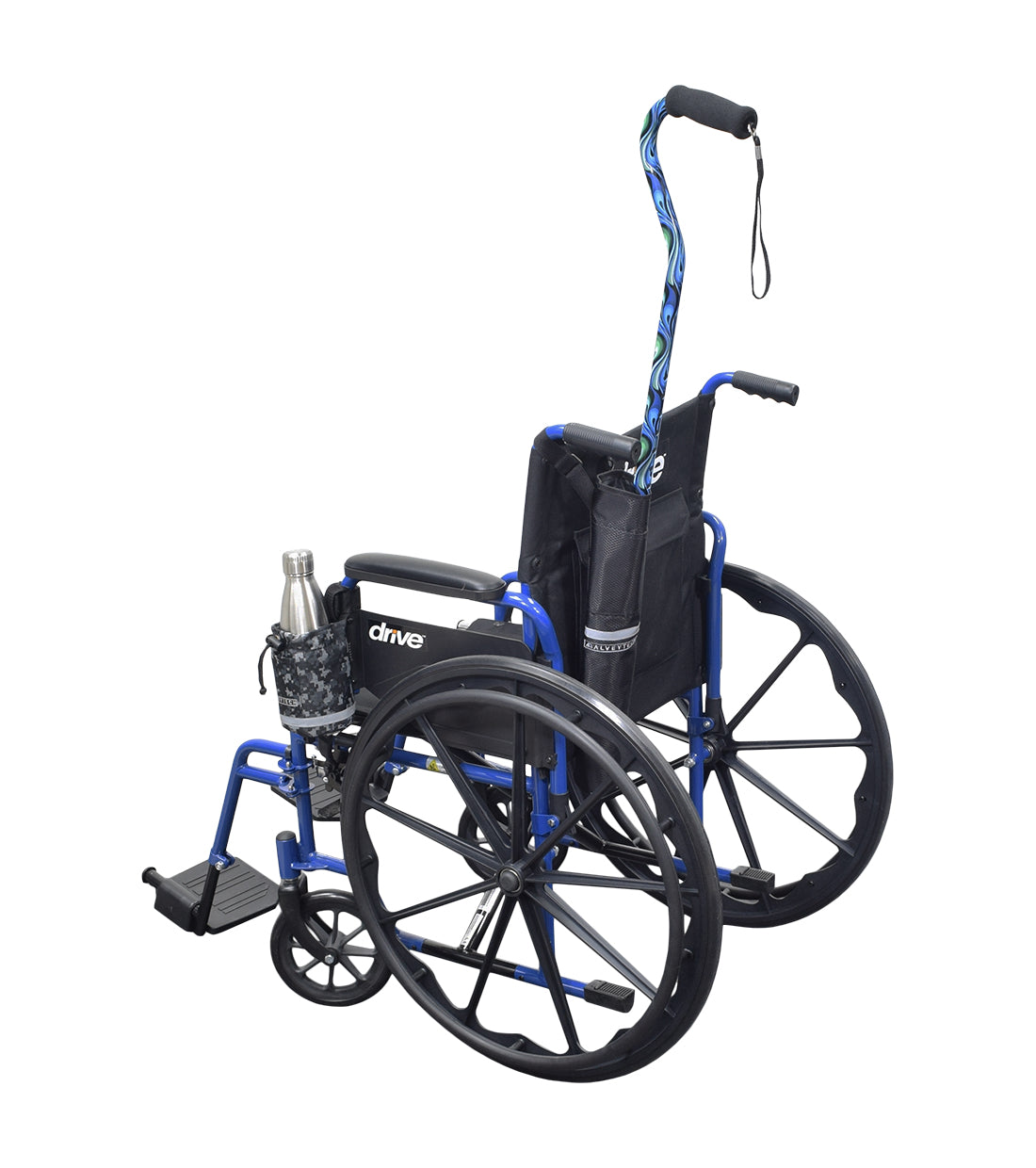 With one for your seat back and one for your armrest, our universal cane holder and cup holder combination for mobility scooters, power chairs, and wheelchairs from AlveyTech is a two-in-one set of top-quality fabric mobility accessories. Taking your daily necessities along as well as a can or bottle