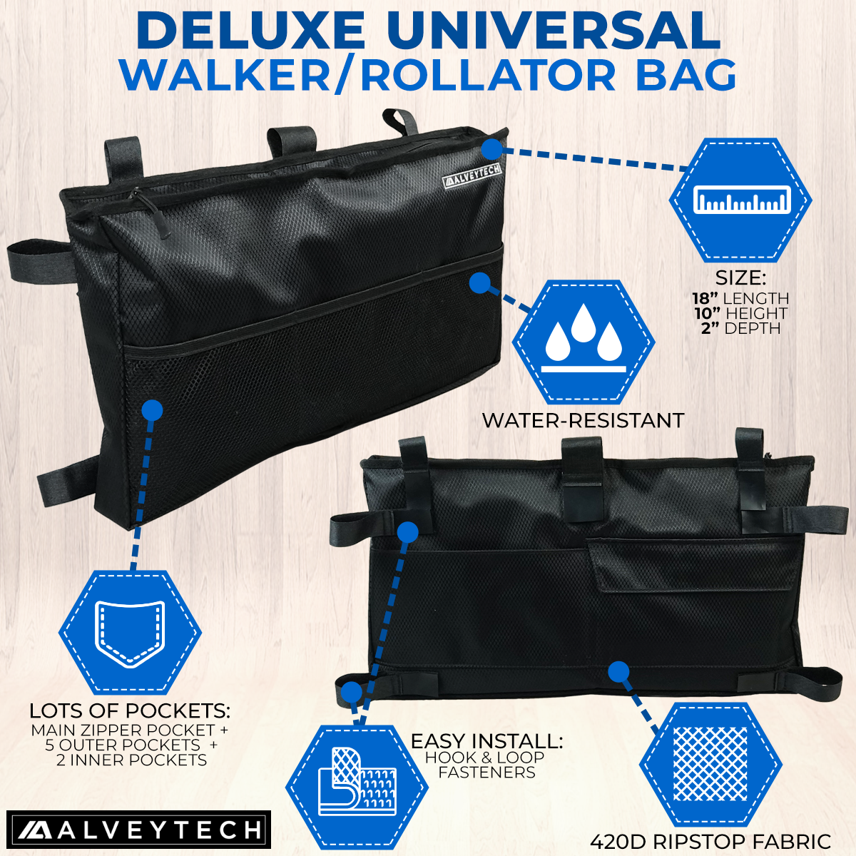 Deluxe indeed; this high quality, water-resistant nylon universally-mounted bag from AlveyTech is the perfect place to store your personal items such as a checkbook, medications, or just about anything else you might need. The copious carrying capacity of this 10" by 18" satchel is impressive with three handy mesh pockets in front, two in the rear, and a single large pocket in the middle that is further divided into additional internal pouches. You can attach this walker bag to the inside or to the outside of the walker or rollator using its "Easy-Install" Hook & Loop fasteners.