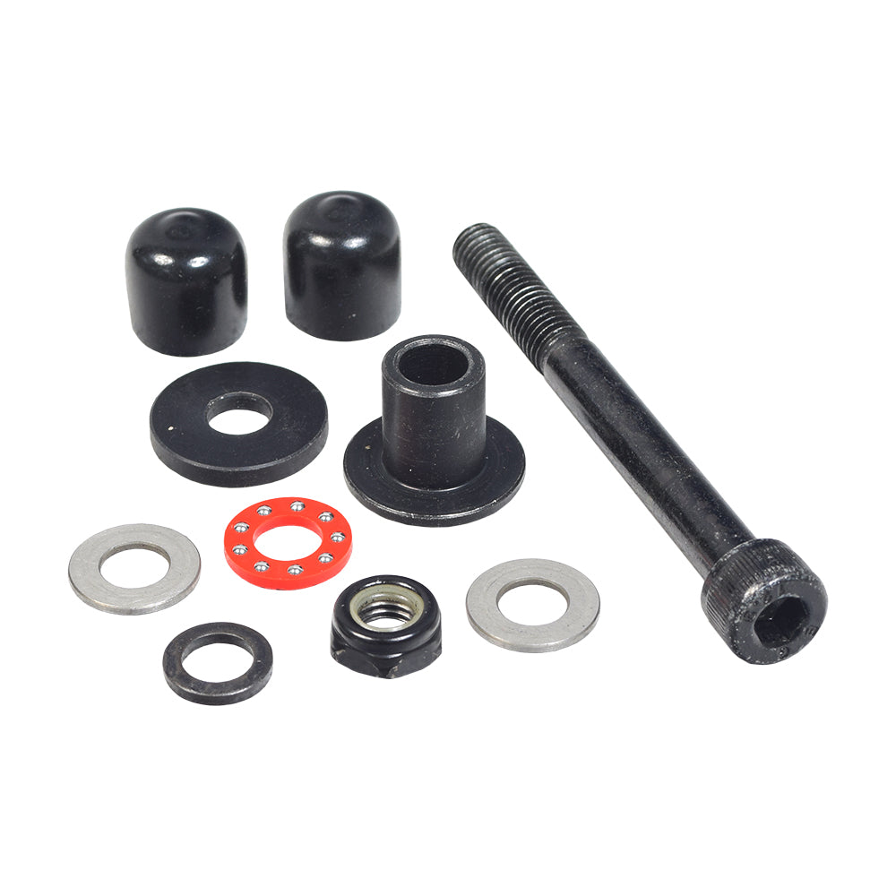 This hardware set includes the bolt, washers, spacers, nuts, and black rubber caps.