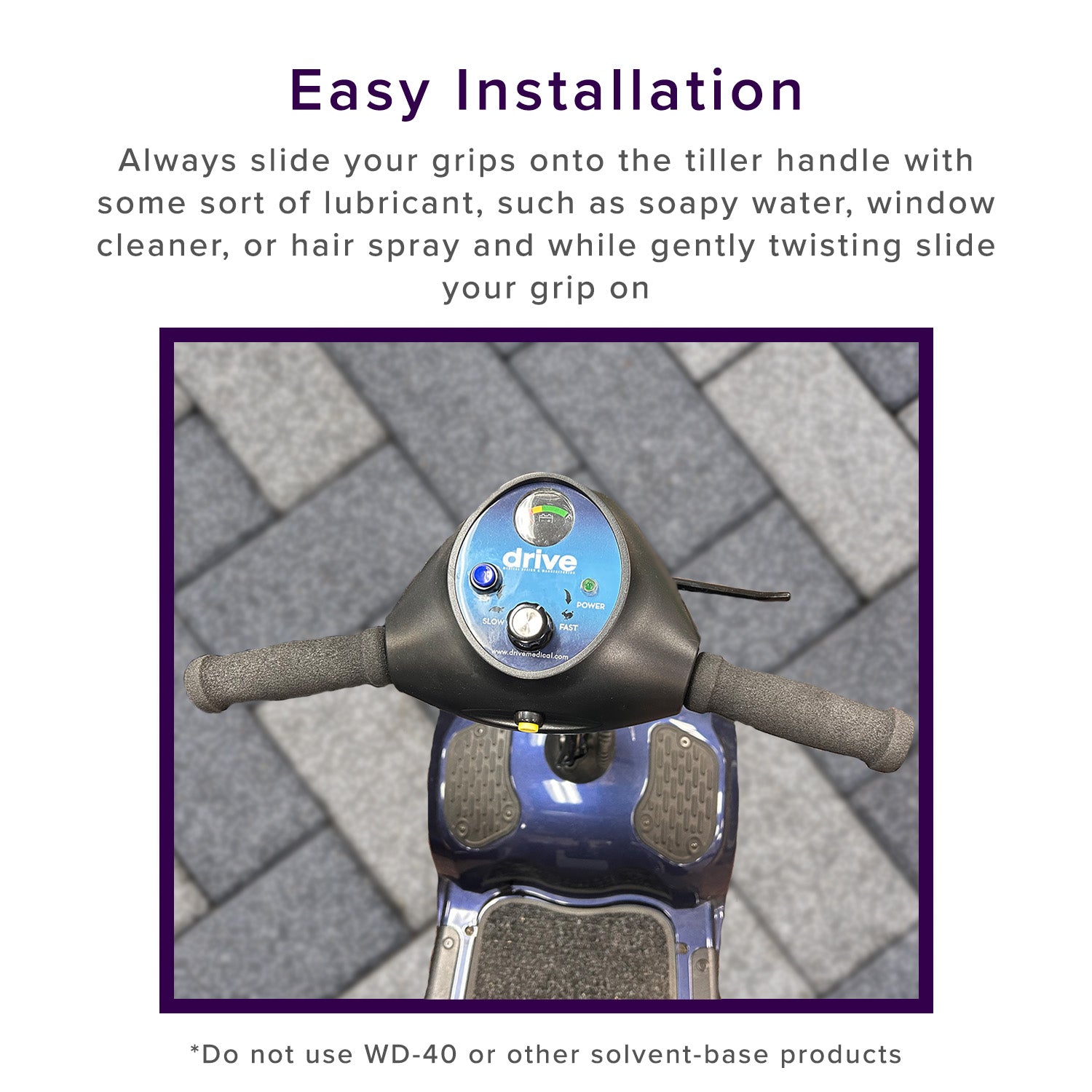 Note: These great little grips are a tight fit, but will easily slide onto the standard 7/8" tiller handle once you know the professional scooter mechanic's secret.