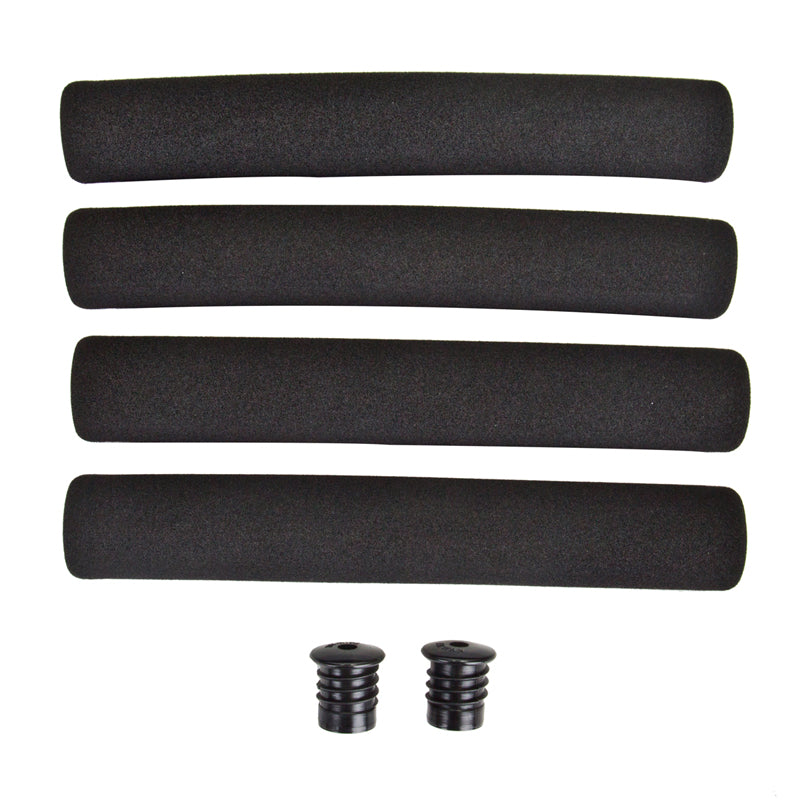 These foam road handlebar grips are an excellent addition to your road bike. You get four of these soft but durable foam grips as well as a pair of handlebar end plugs to help hold them in place. Each of the four pieces measure 8-1/4" (215 mm) long, plenty enough to pad both the inboard and outboard sections of your handlebar on either side of your levers.