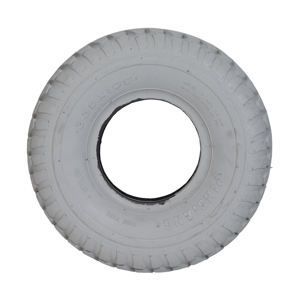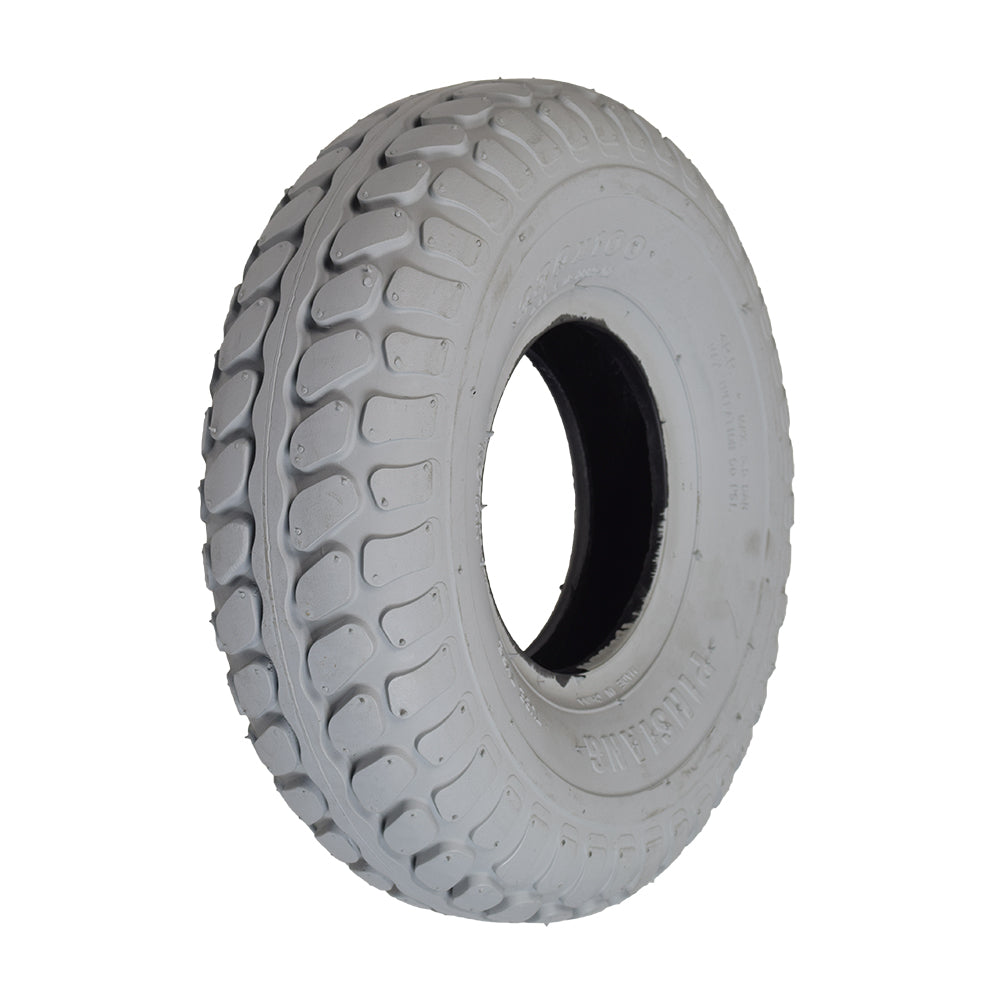 The 4.00-5 (13"x4", 330x100) pneumatic rear tire for the Shoprider Sprinter XL4 Deluxe (889B-4XLS) mobility scooter is also known by the English and metric sizes of 13"x4" and 330x100. This pneumatic tire features non-marking gray rubber and an IA-2889 multi-purpose tread.