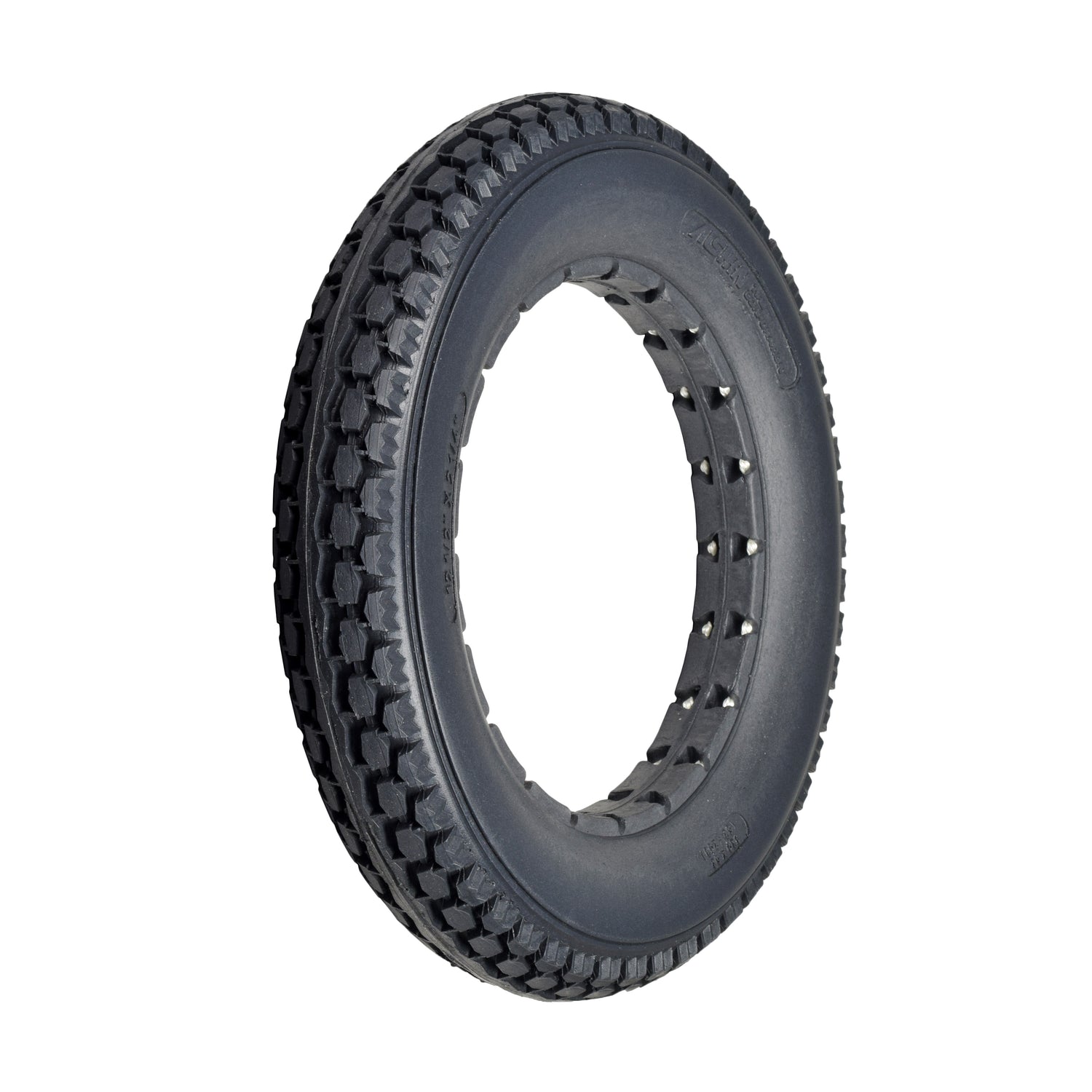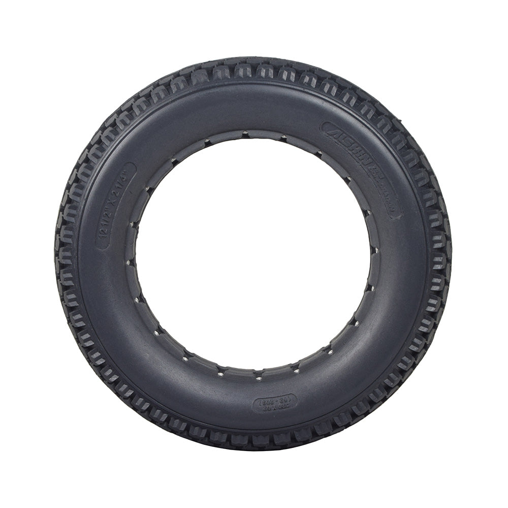 The 12-1/2"x2-1/4" dark gray solid urethane mobility tire has a great knobby tread that is suitable for both indoor and outdoor use. This dependable and flat-free tire design is made of solid, latex-free urethane.