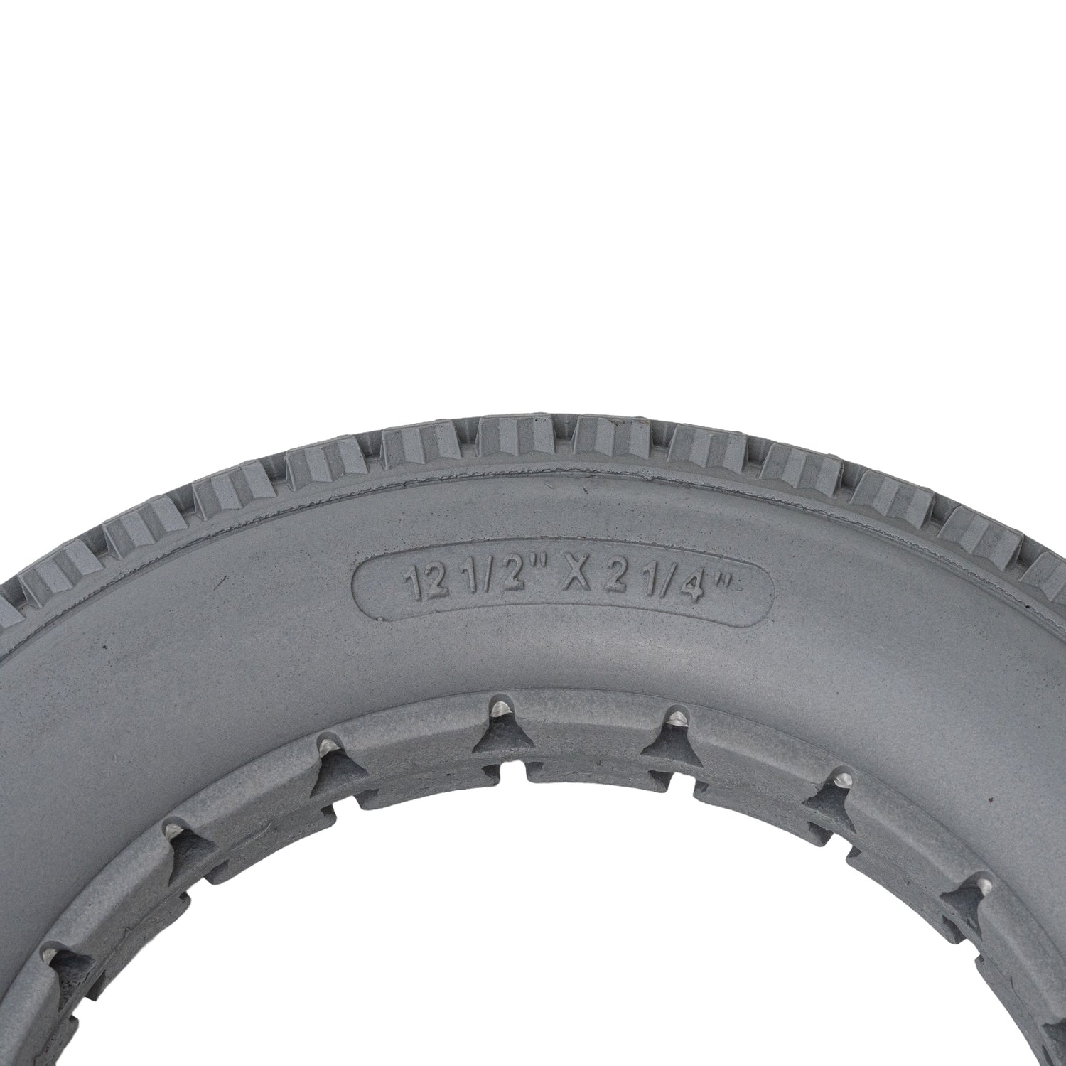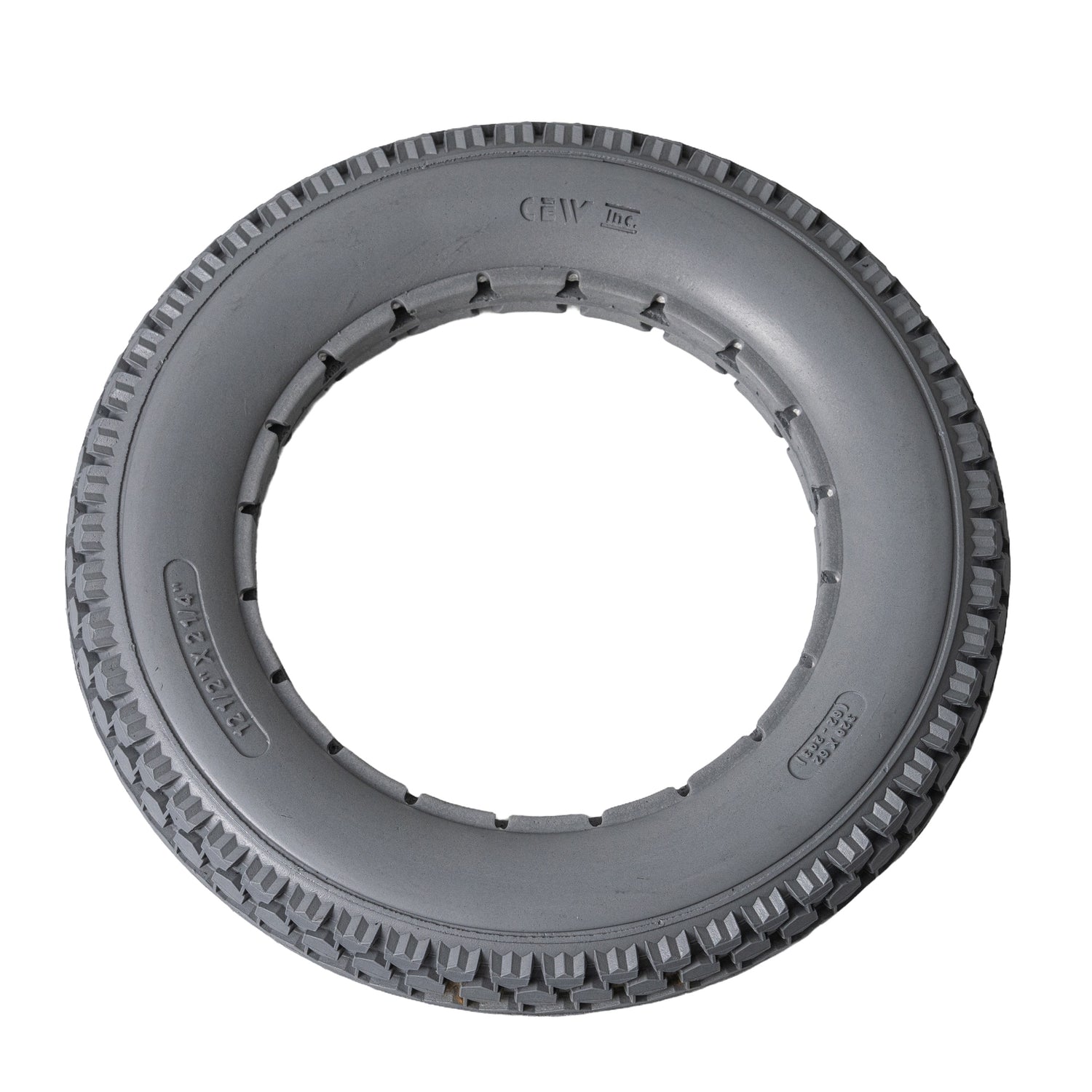 The 12-1/2"x2-1/4" light gray solid urethane mobility tire has a great knobby tread that is suitable for both indoor and outdoor use. This dependable and flat-free tire design is made of solid, latex-free urethane.