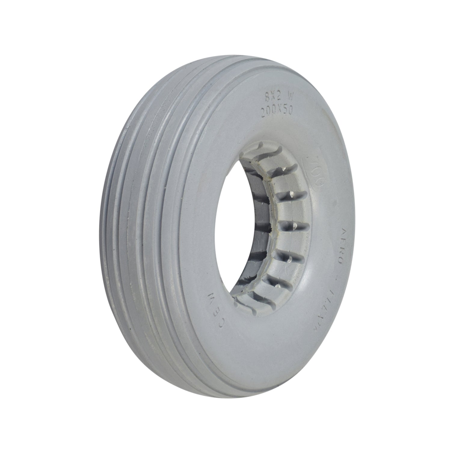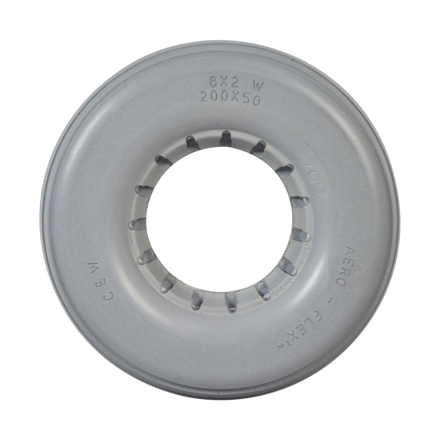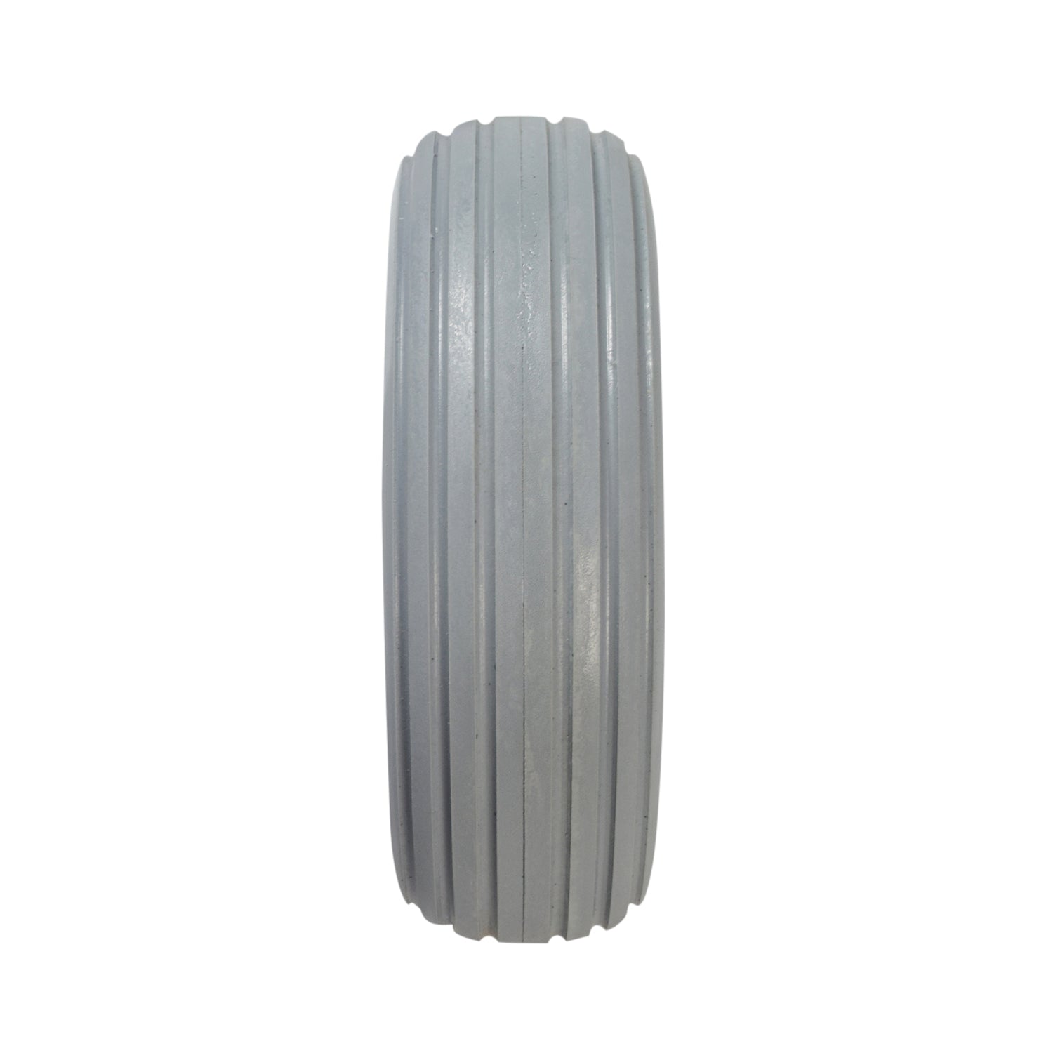 Perfect for indoor or outdoor use, the 8"x2-1/4" light gray solid urethane mobility tire with ribbed tread is dependable and flat-free. Solid urethane means latex free as well. Made to fit a two-piece wheel assembly.