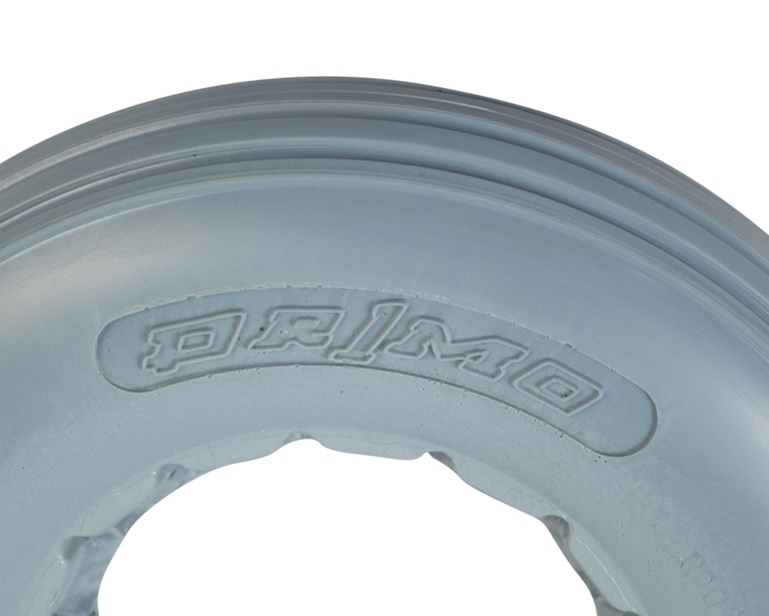 Perfect for indoor or outdoor use, the 8"x2" (200x50) light gray solid urethane mobility tire with ribbed tread is dependable and flat-free. Solid urethane means latex free as well. Made to fit a two-piece wheel assembly.