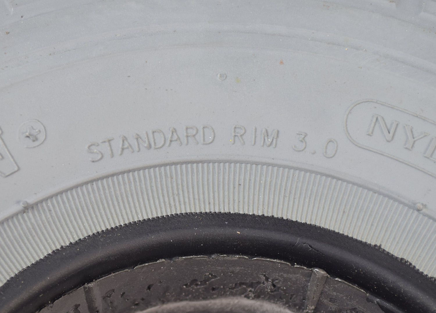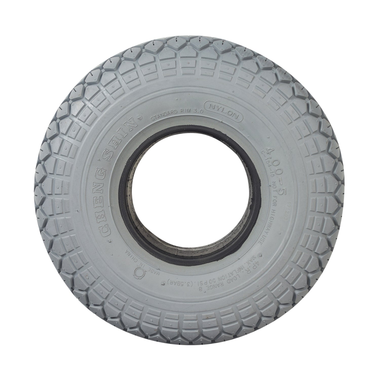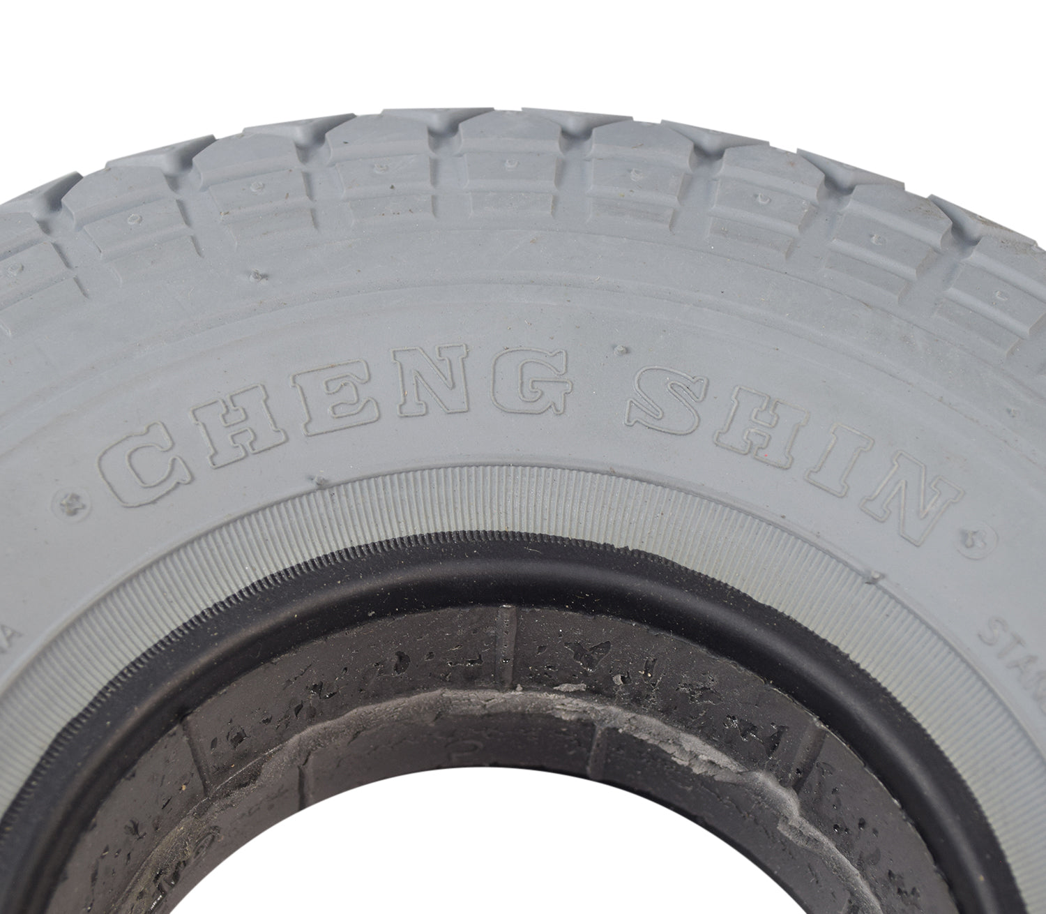 Also known as a 13"x4" or 330x100, 4.00-5 foam-filled solid flat-free tire with C154 Diamond tread pattern fits many mobility scooters and power chairs. This non-marking gray rubber beauty may be used as a replacement for your original equipment solid tire or replace your old pneumatic tire. Pneumatic air-filled tires can typically be replaced with foam-filled flat-free tires of the same size very easily.