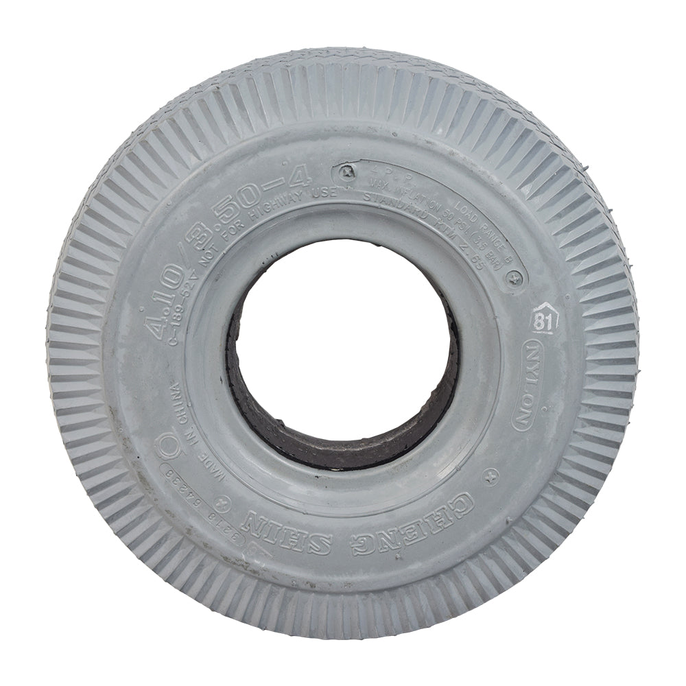 The 4.10/3.50-4 foam-filled flat-free tire with C189 Sawtooth tread from Cheng Shin is used with a variety of mobility scooters and power wheelchair applications. This tire uses a standard foam