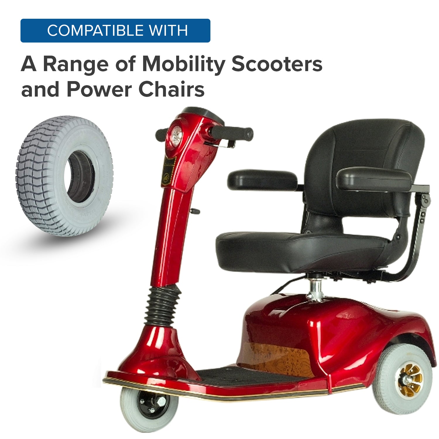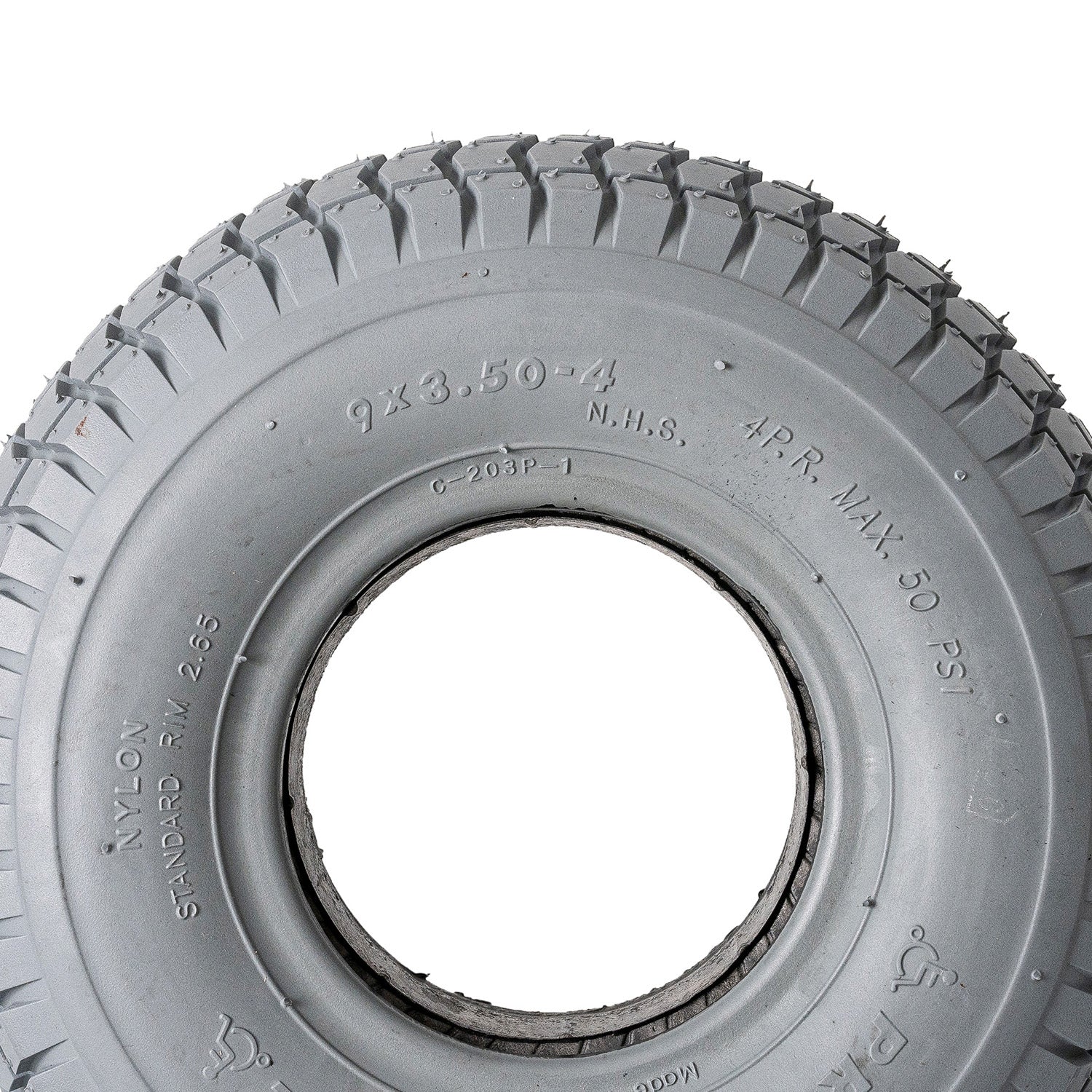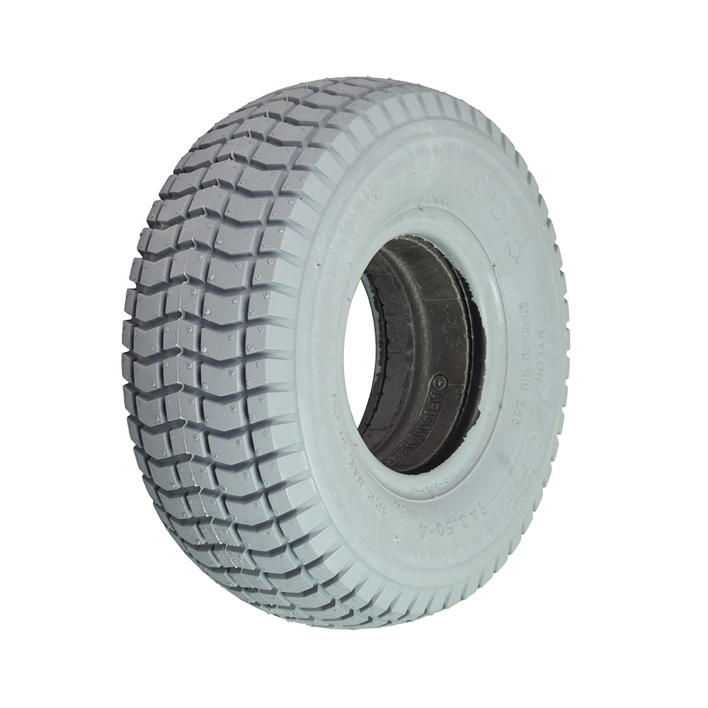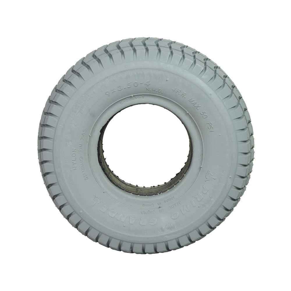 The 9x3.50-4 gray foam-filled (flat free) mobility tire with C203 Grande Knobby tread from Primo fits a number of mobility scooters and power chairs, and simply cannot go flat. This size tire is used as the rear tire for some mobility scooters, as well as being compatible with the front wheels of first-generation Golden Technologies Companion II scooters. If you are in doubt, please refer to our Compatibility tab for a list of known models that can uses this superior non-marking gray rubber tire.