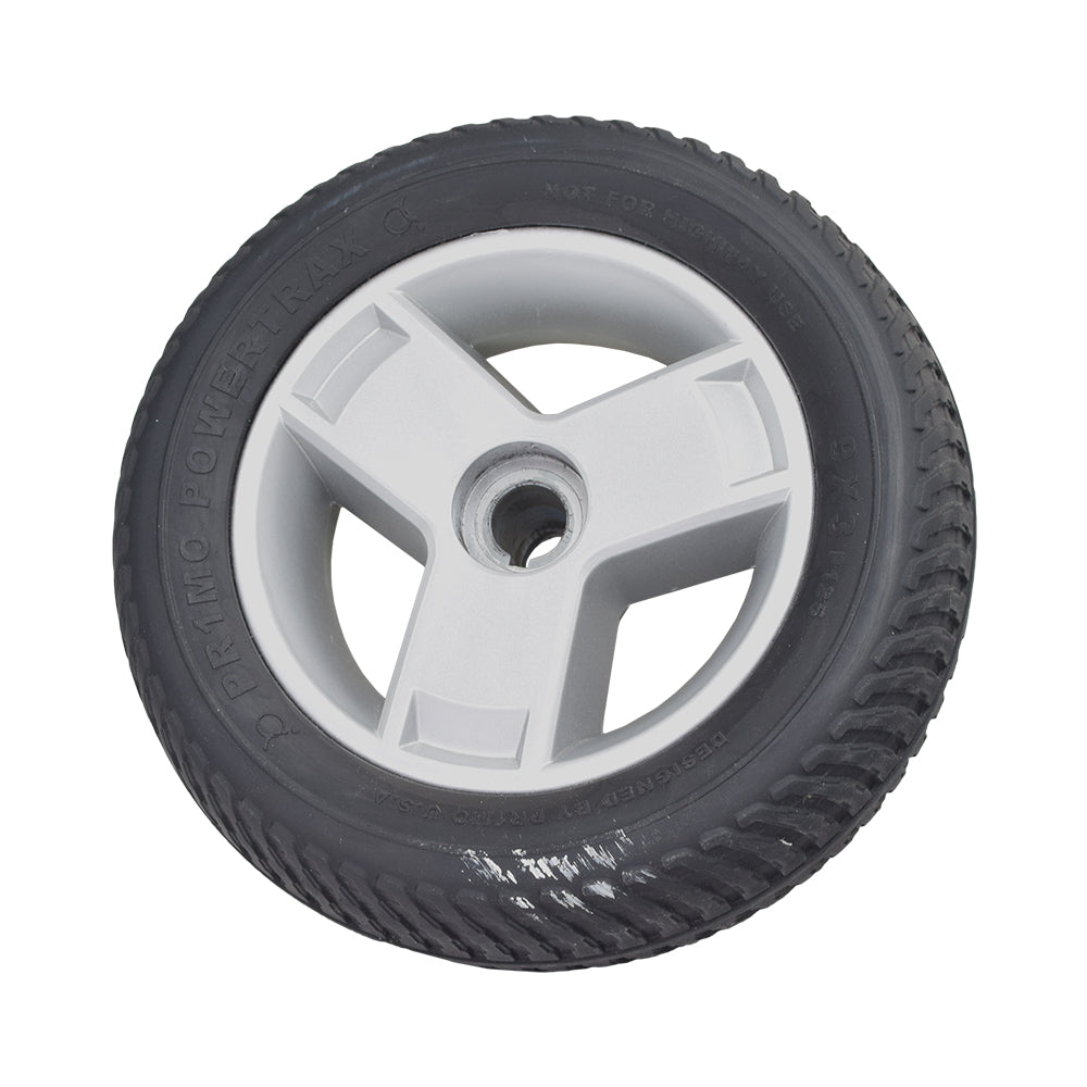 This complete drive wheel assembly includes a flat-free non-marking black tire and stylish silver tri-spoke rim.