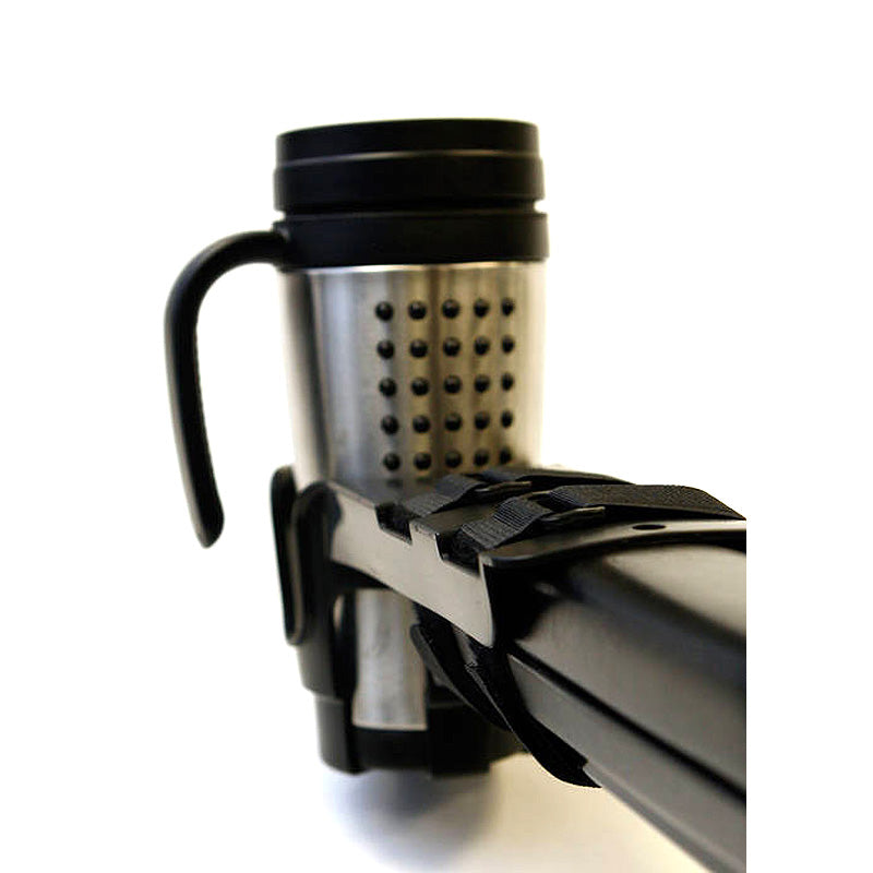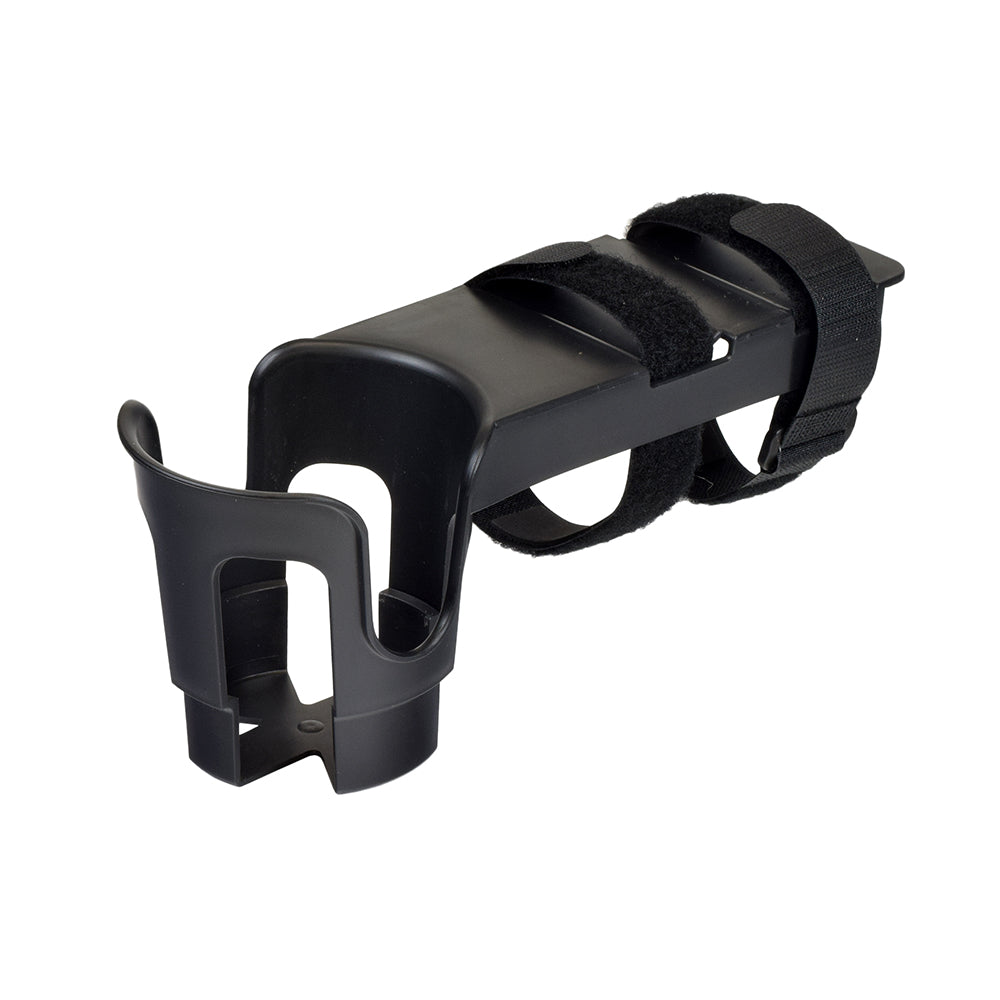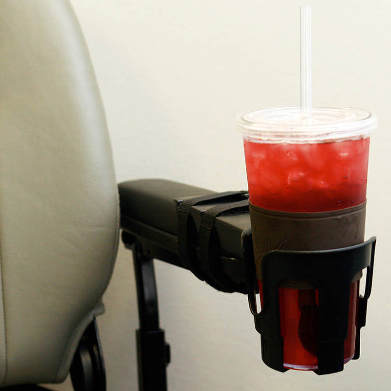 The "Nearly" universal scooter cup holder is one of those rare product items that comes along and makes us sit up and take notice. With all of the different scooter drink holder designs for this scooter model or that power chair brand, the Nearly Universal Cup Holder is much different... it's nearly universal. You can mount this scooter cup holder on just about any and every seated device with a relatively flat armrest top that you can wrap the Velcro straps around. Just the right cup holder for just about every brand and model of electric mobility scooters, power chairs, wheelchairs, and more.