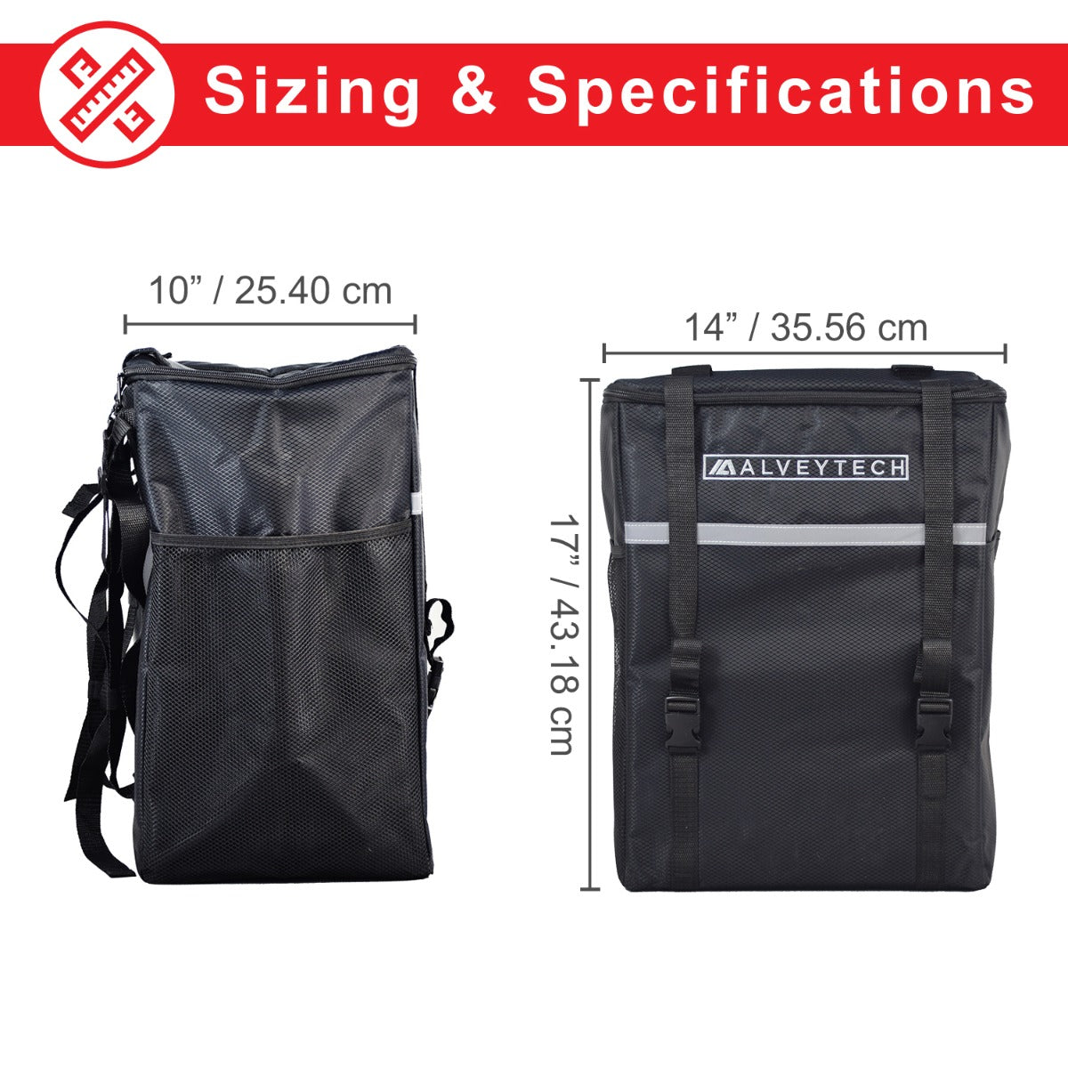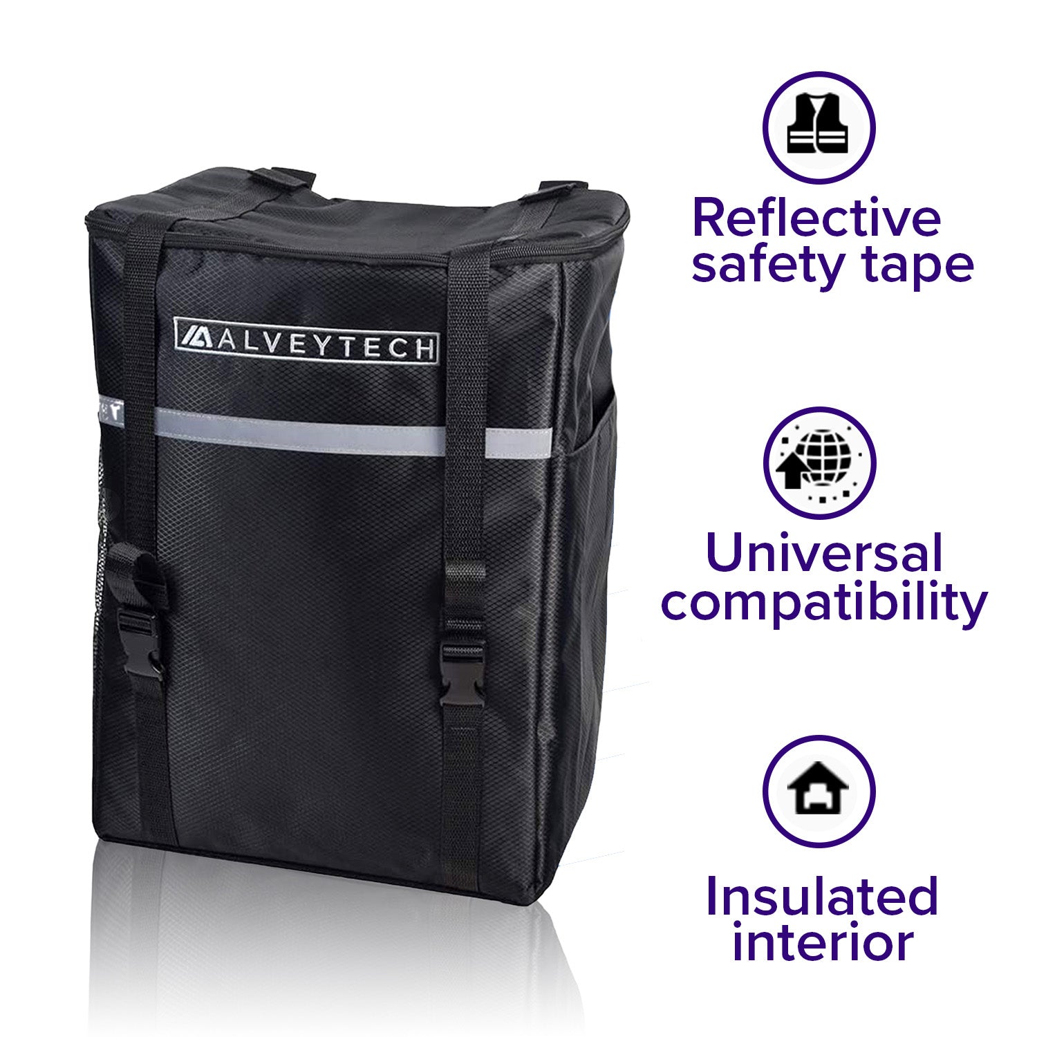 The extra large insulated seat back bag from AlveyTech is designed for convenient storage on mobility scooters and power chairs. It offers ample space for picnic items, temperature-sensitive goods, rain gear, and other personal belongings. Unlike conventional baskets, the AlveyTech seat back bag keeps your items discreetly secured and out of sight.