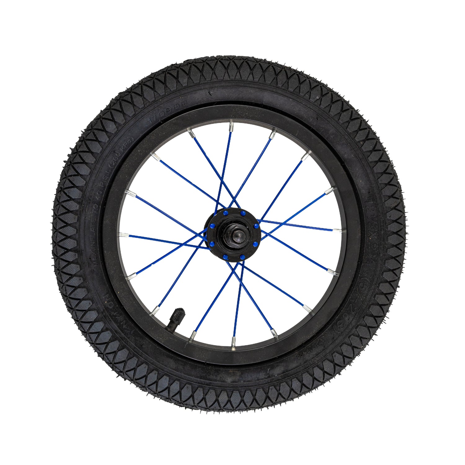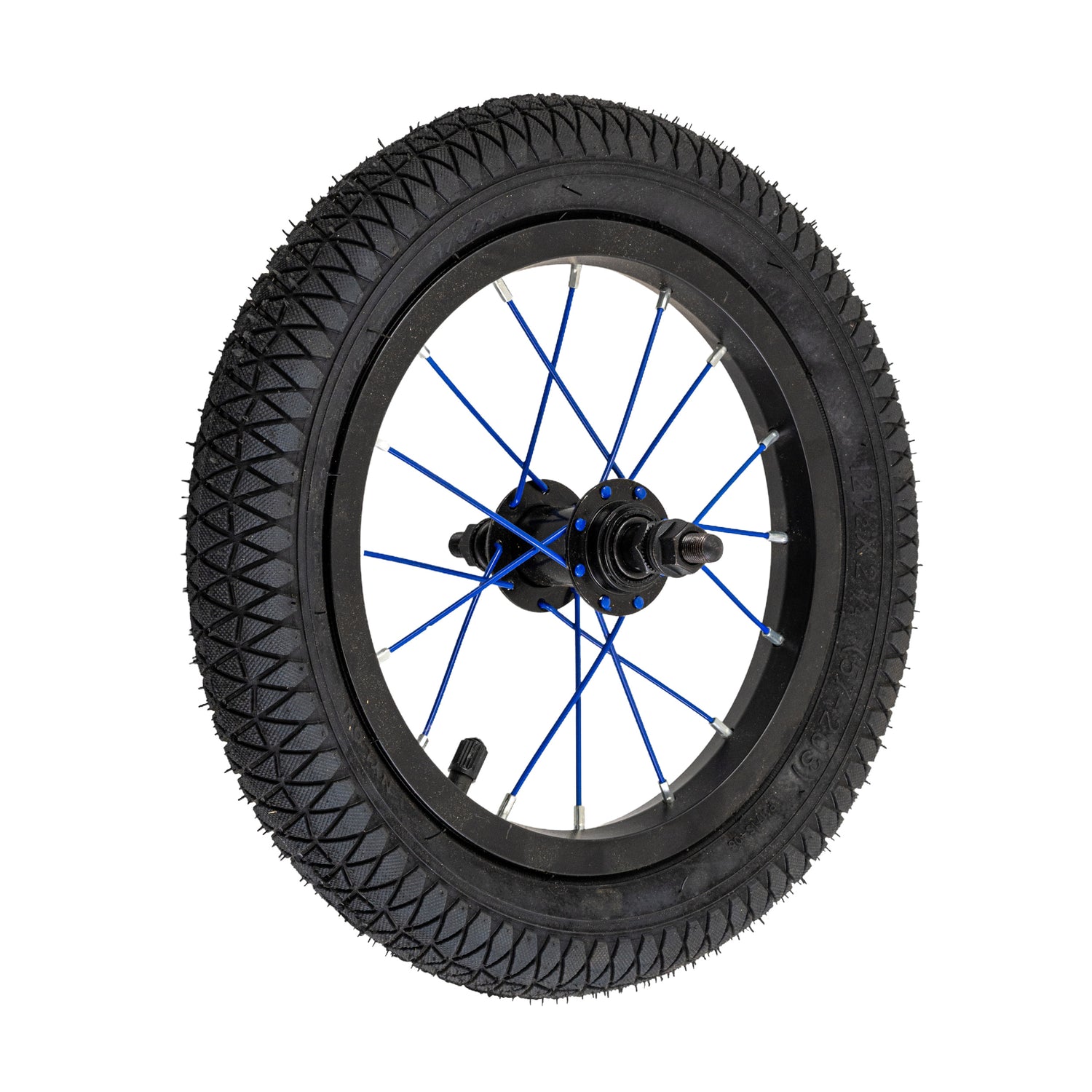 The same 12" wheel assembly for the Mongoose Expo Freestyle Scooter works equally well on the front or the rear. This wheel assembly includes the spoked rim, a Wanda 12-1/2"x2-1/4" pneumatic tire, and an inner tube for the smooth ride.