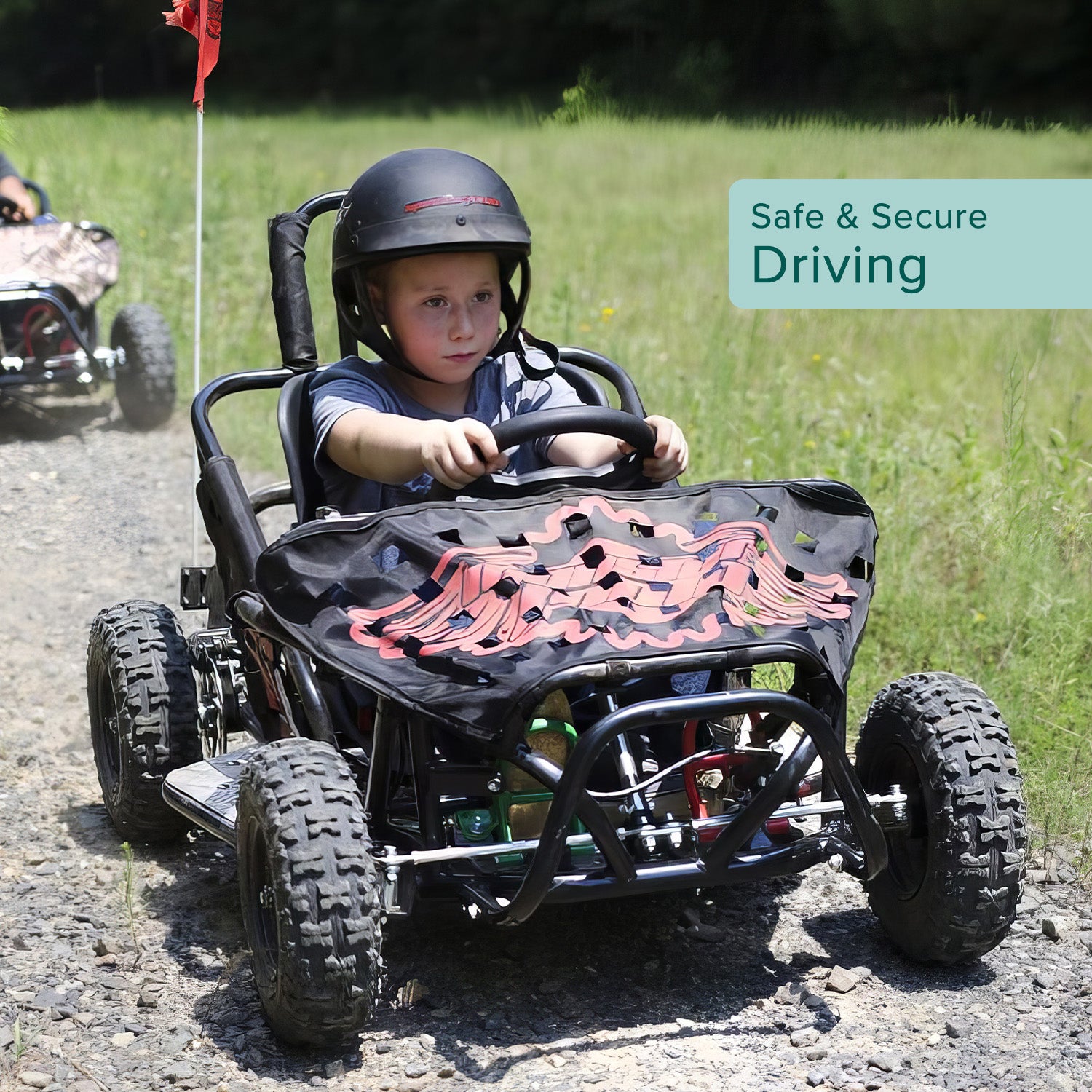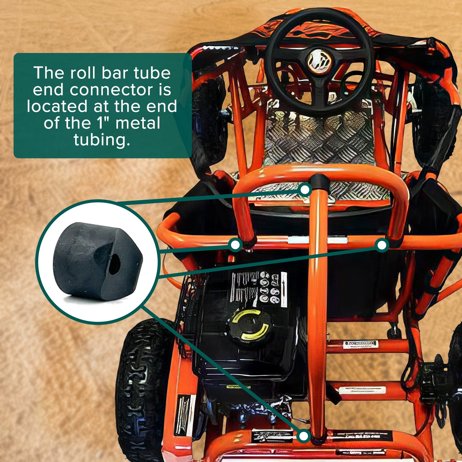 The little black plastic roll bar tube end connector for the Monster Moto / Mega Moto K80 go-kart fits onto the end of the 1" metal tubing. This connector allows the roll bar pieces to be fastened together.