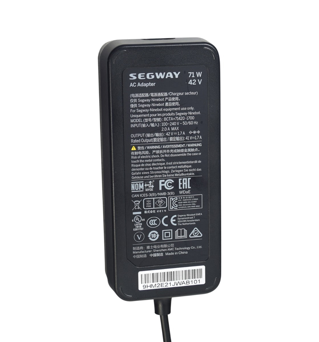 This original 42 volt coaxial battery charger for the Ninebot by Segway ES2 electric scooter is the same charger that Ninebot supplies with a new ES2 scooter. Optimized for use with Lithium-ion batteries, the charger uses a plug-in coaxial connector with an 8 mm outside diameter and a 5 mm inside diameter and provides an output of 1.7 amps.