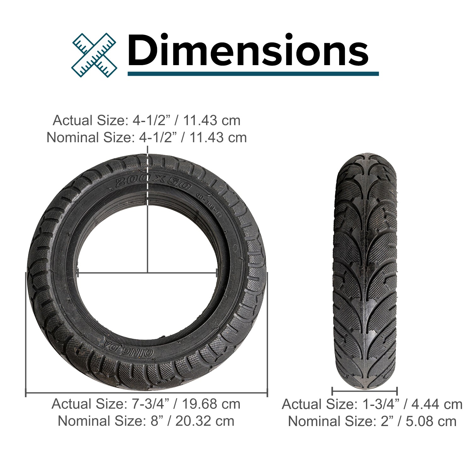- Size - This 200x50 (8"x2") solid tire has a 4-1/2" inner diameter