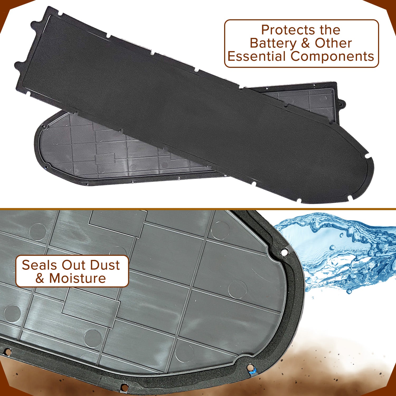 Note: The gasket comes pre-cut with a peel & stick adhesive backing to adhere it to the battery tray bottom.