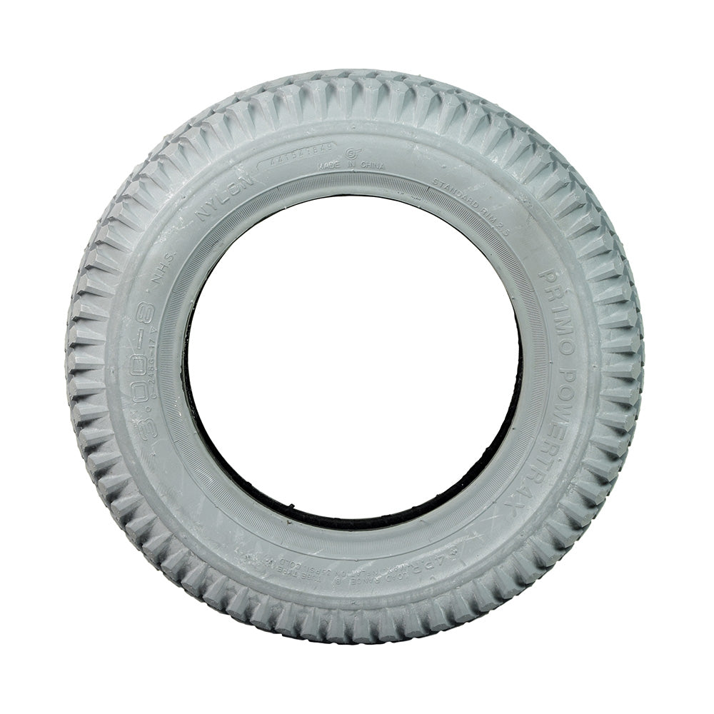 The Primo brand 14"x3" (3.00-8) pneumatic tire with C248G Powertrax tread for mobility scooters is a very popular tire for scooters and power chairs with 8" rims. Like other pneumatic tires, this requires a 3.00-8 inner tube.
