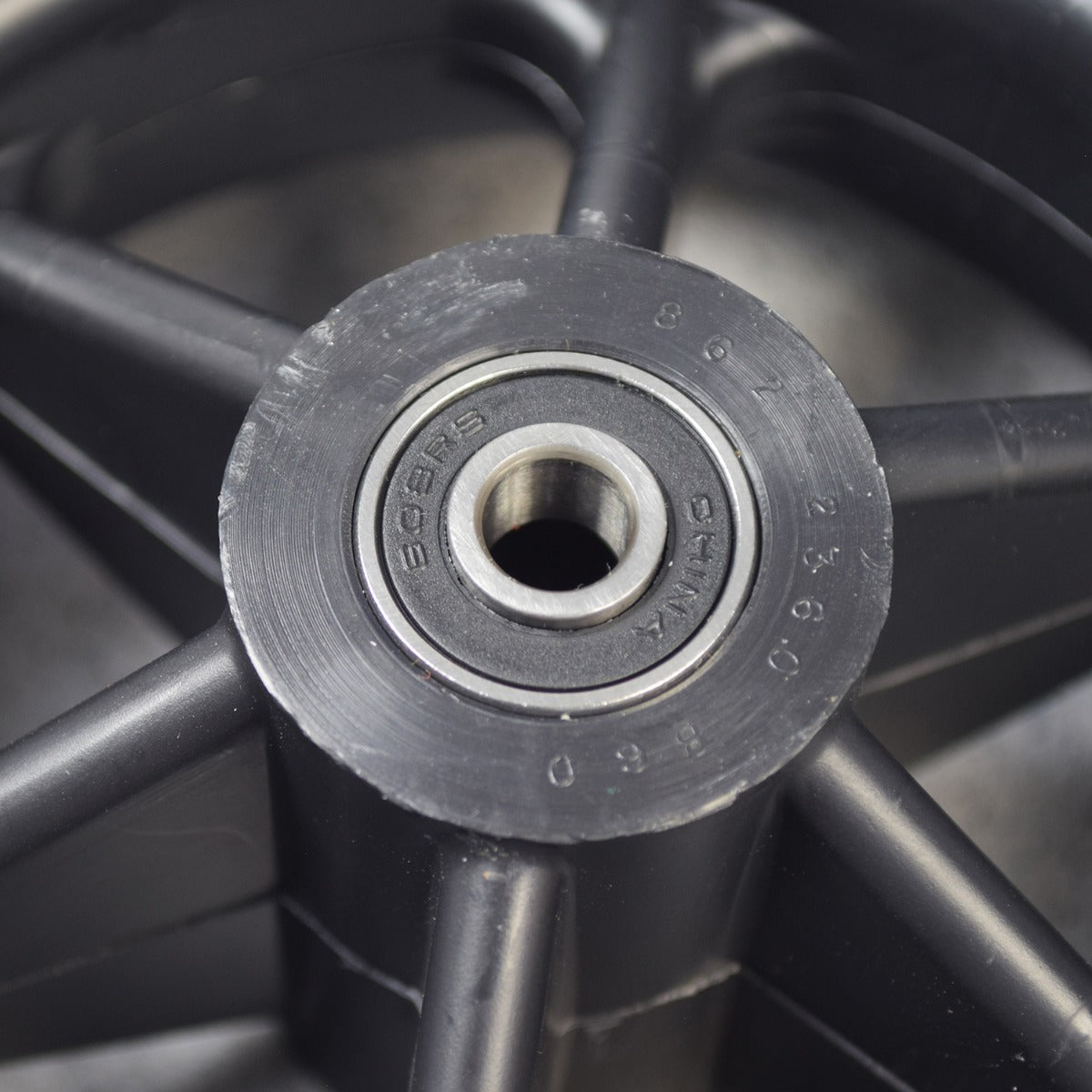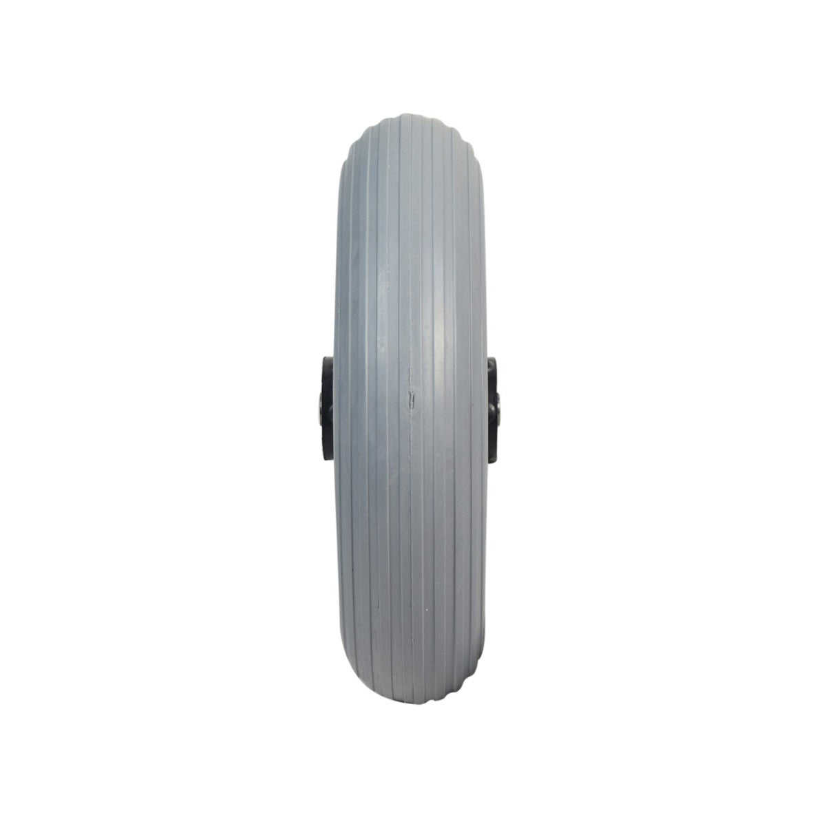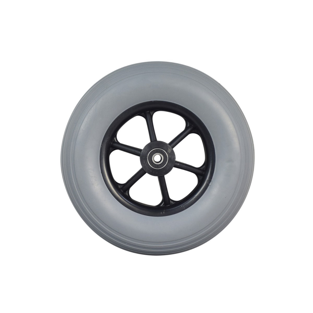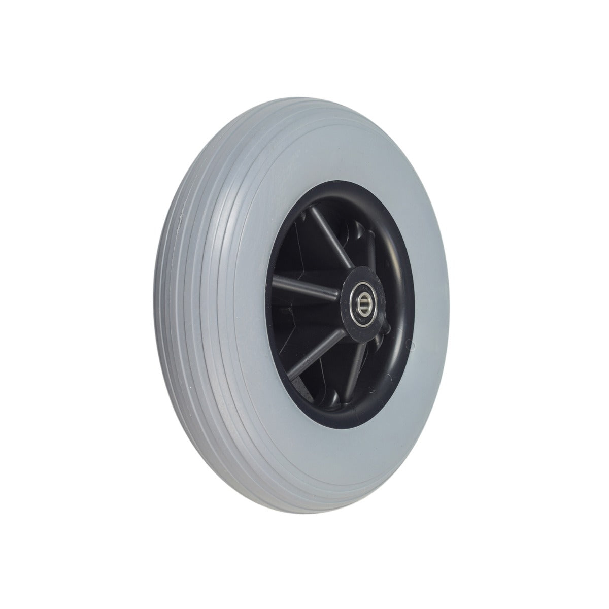 The 200x50 (8"x2") rear caster wheel for PaceSaver Scout RF series power chairs features a solid molded-on gray tire on a 6-spoke black rim. The wheel includes a set of two pre-installed 608RS bearings.