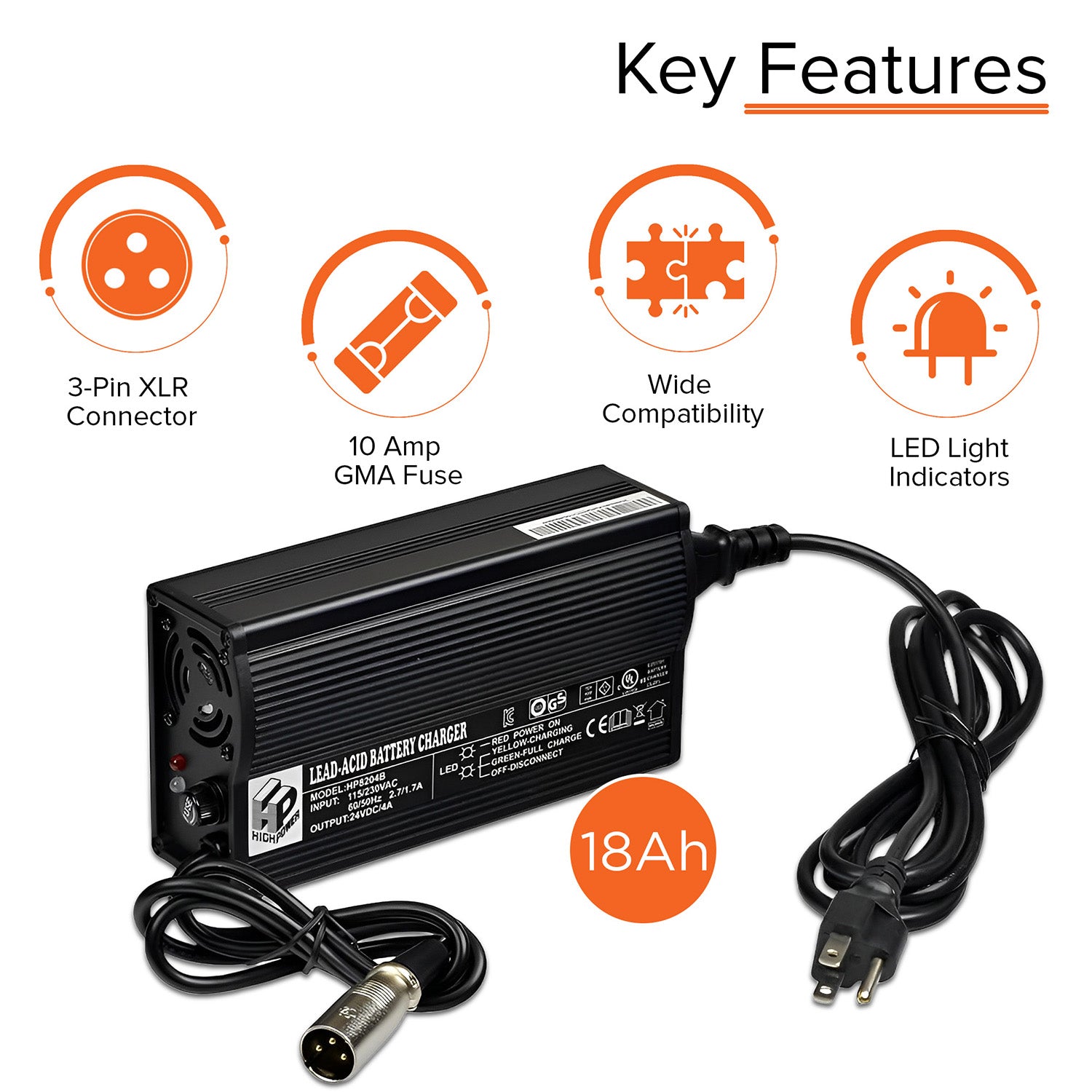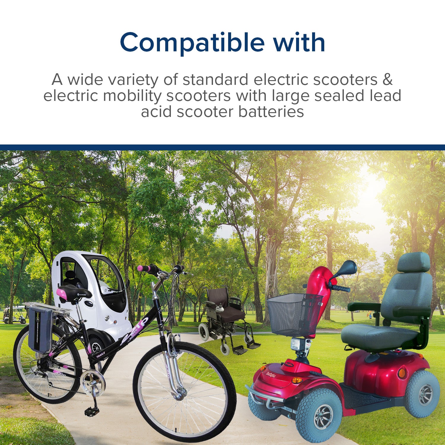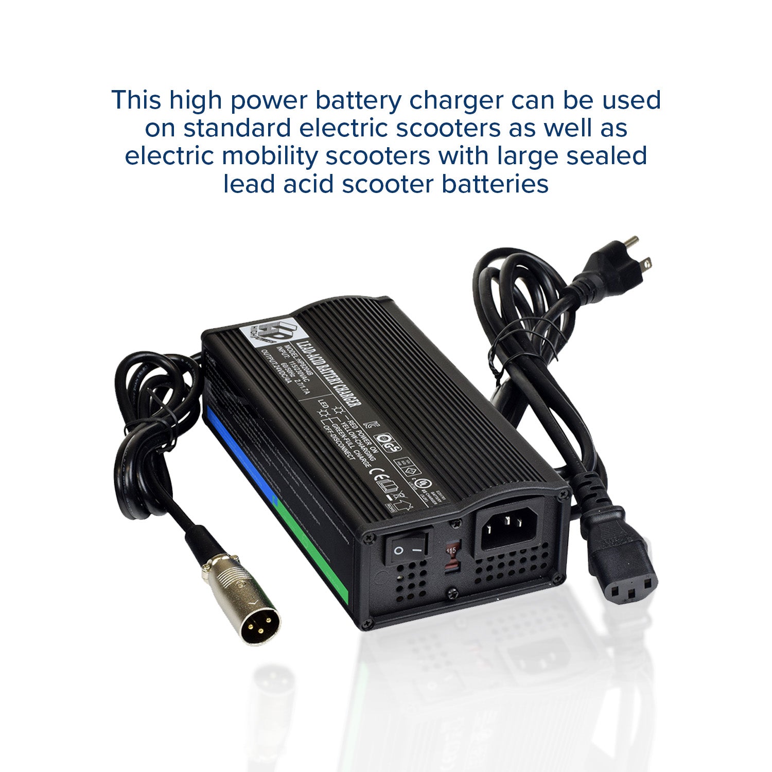 This High Power battery charger can be used used on standard electric scooters as well as electric mobility scooters with large sealed lead acid scooter batteries (18 Ah batteries and above). The charger is equipped with an included 10 amp GMA fuse.