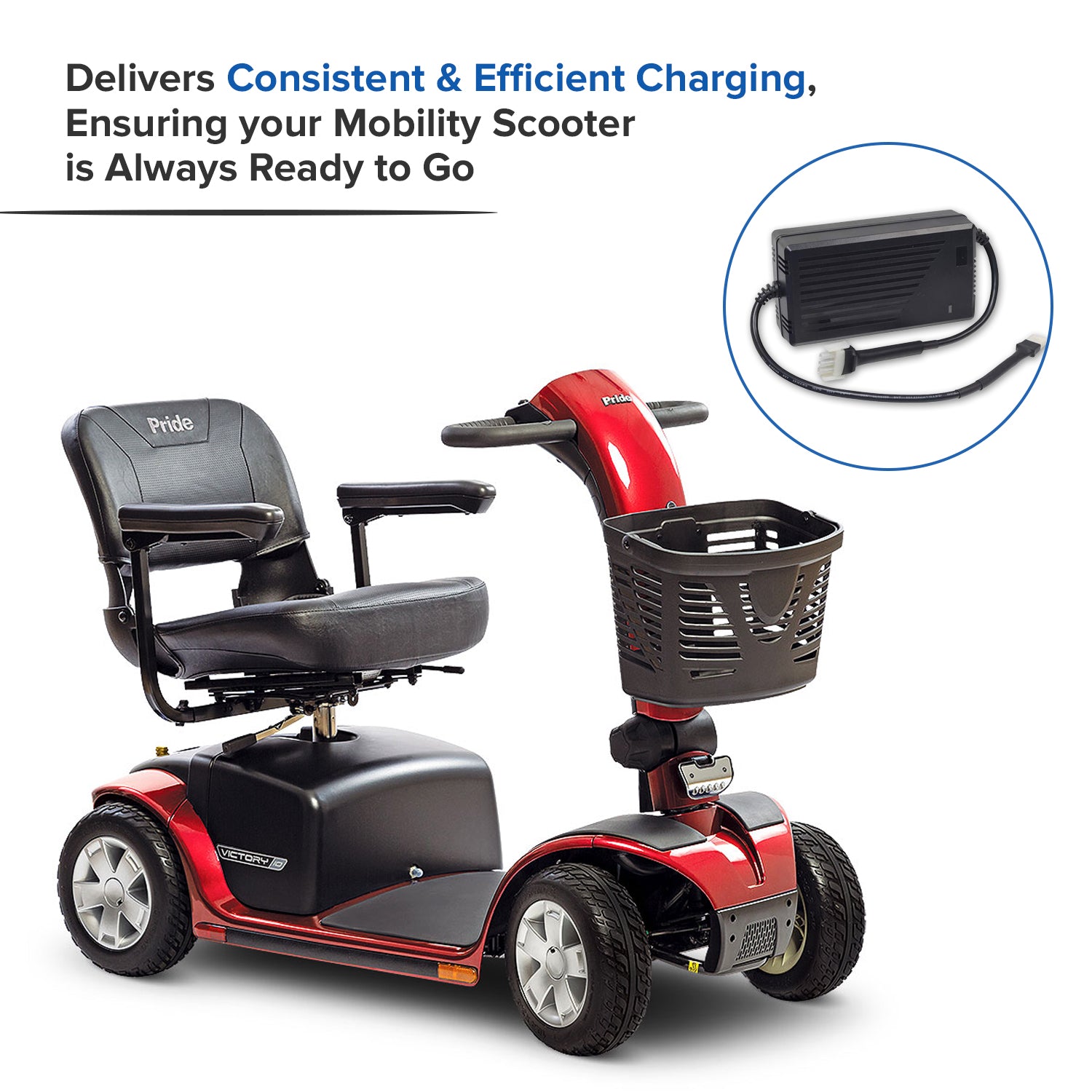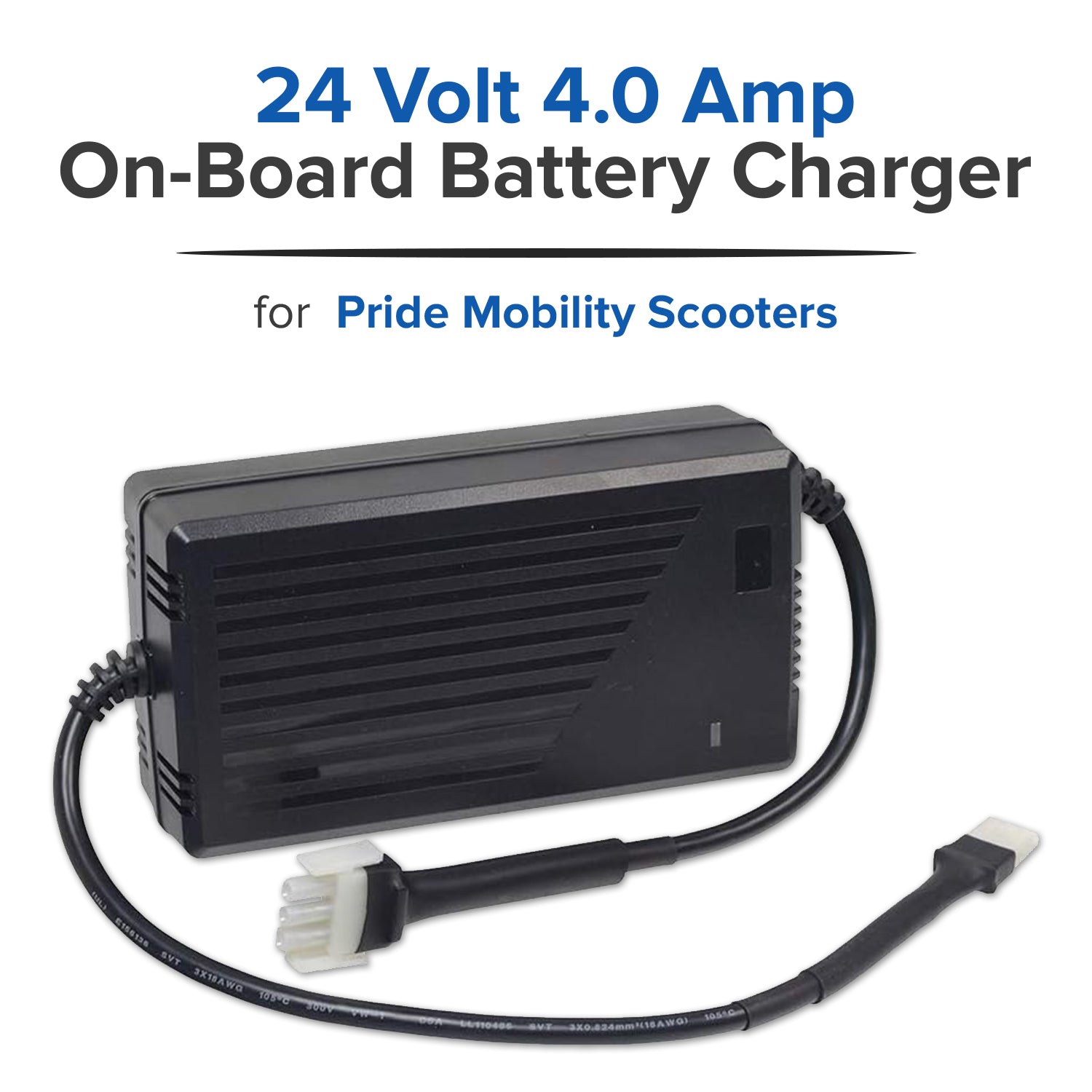 24 volt 4.0 amp on-board battery charger for several 3-wheel and 4-wheel Pride mobility scooter models. Automatic 3-stage battery charger comes complete with OEM connectors for easy installation.