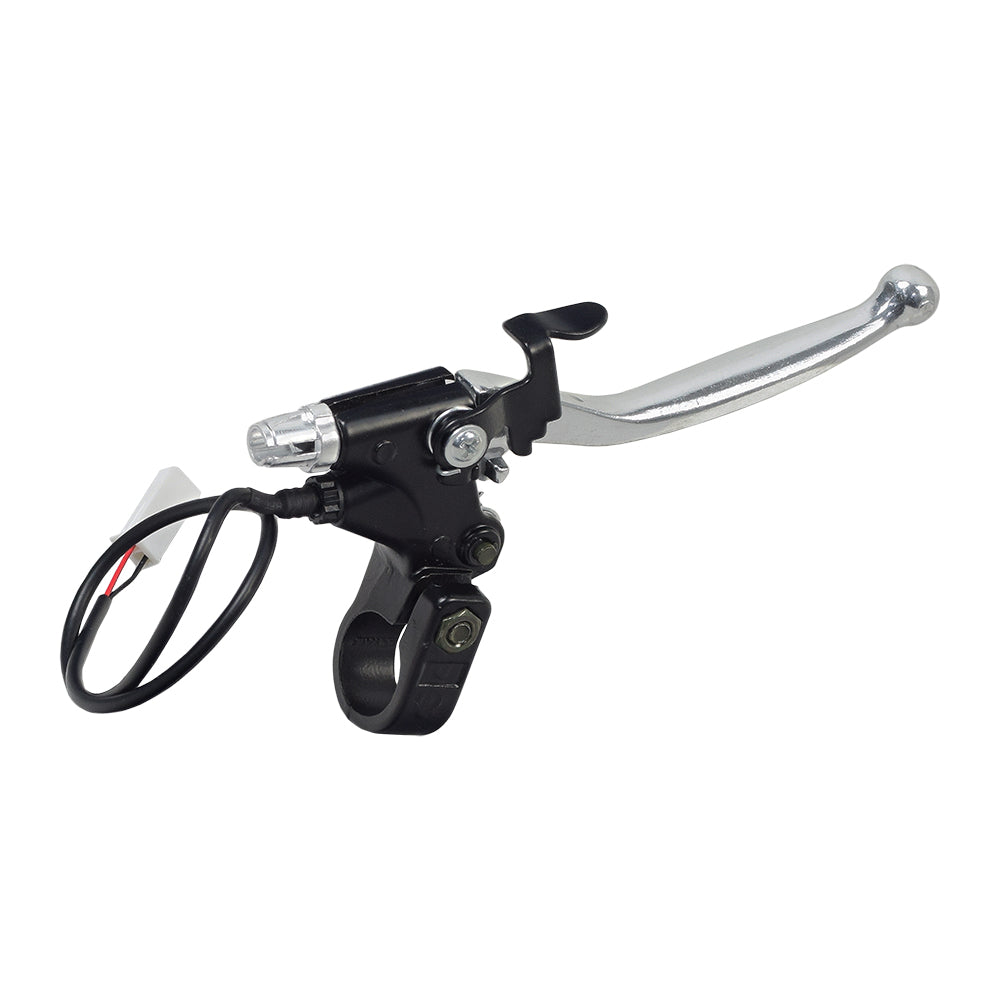 Unlike most electric mobility scooters, the Pride Mobility Raptor (R3-1700) and it's Baja Mobility Raptor 2 (BA300) clone both use a similar braking system as might be found in a full-size gas-powered street scooter. In keeping with the model's "street" style, the brake handle for the Raptor (R3-1700 or BA300) scooter fits onto the left side of the scooter's handlebar (or "tiller"). A traditional brake cable (not included) runs from the lever down to the scooter's front brake drum.