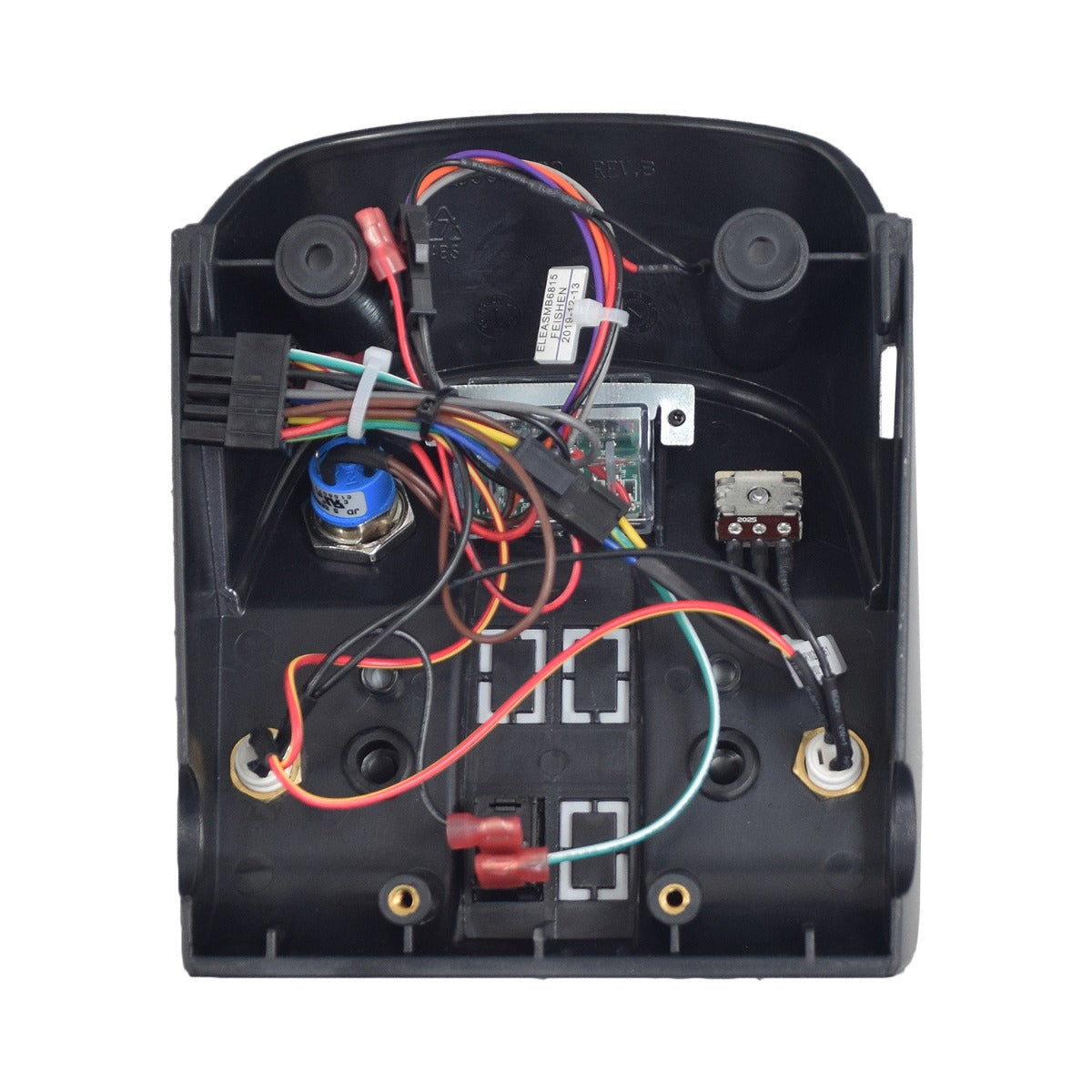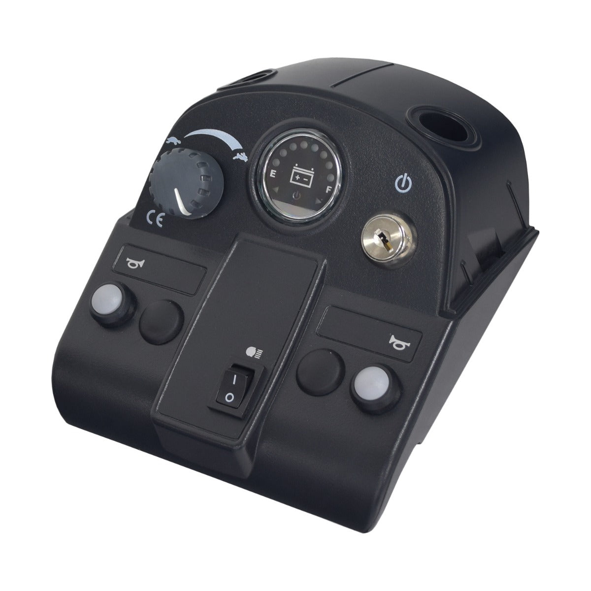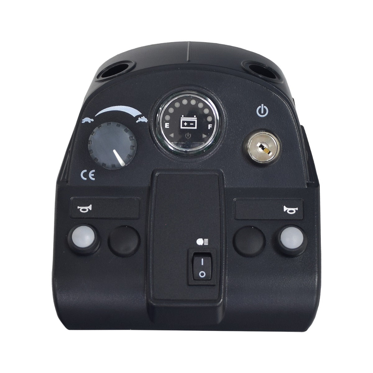 This assembly includes the black upper shroud, the speed pot and harness, the speed control knob, key switch, horn button, and LED meter.