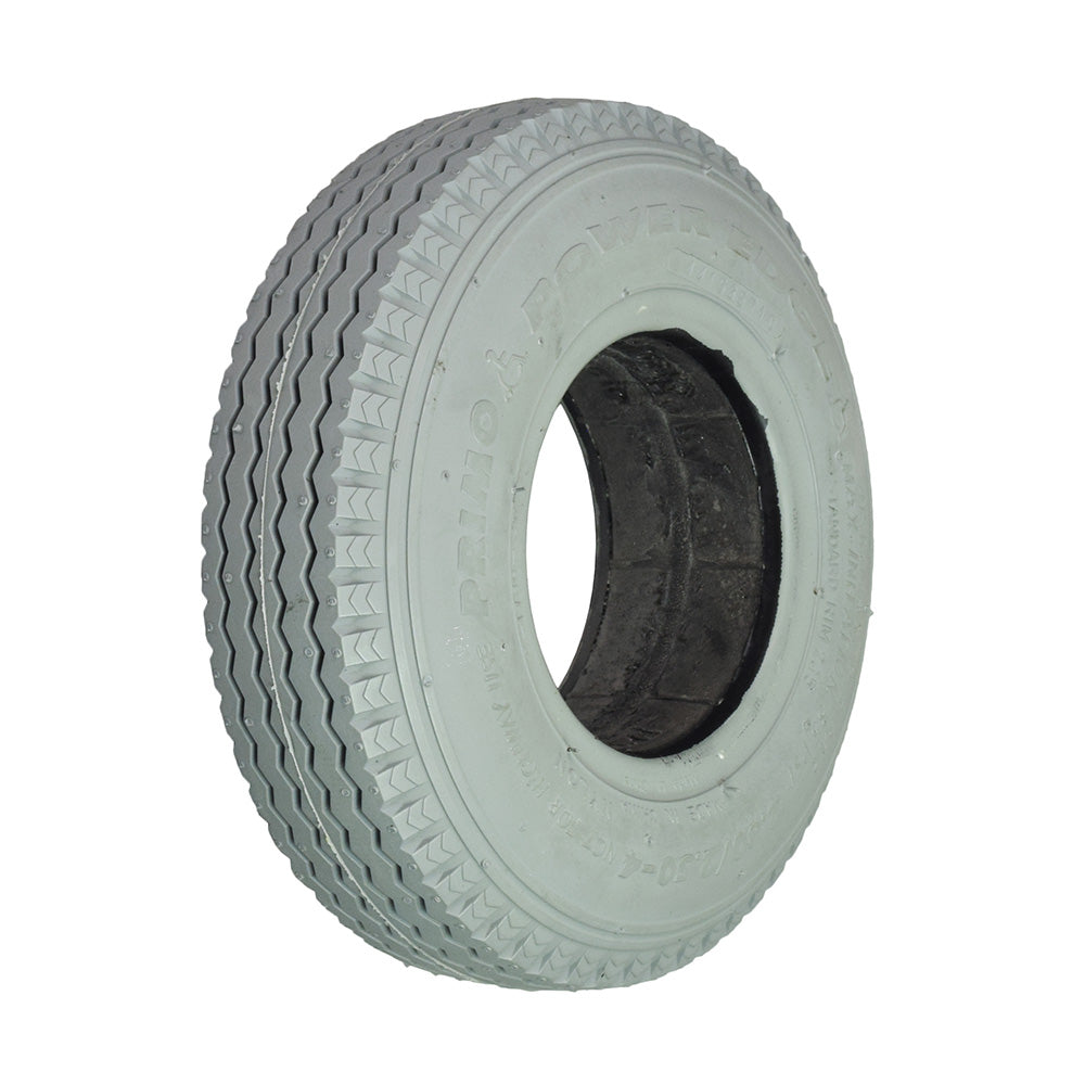 The Primo 2.80/2.50-4 (9"x3") foam filled mobility tire is available with your choice of a 2-3/8" bead width or a 2-5/8" bead width. Either of these Primo tires features a sawtooth tread, and they are compatible with 4" diameter rims. The foam filling means that is is a flat-free, worry-free tire that is equally dependable on hard or soft surfaces.