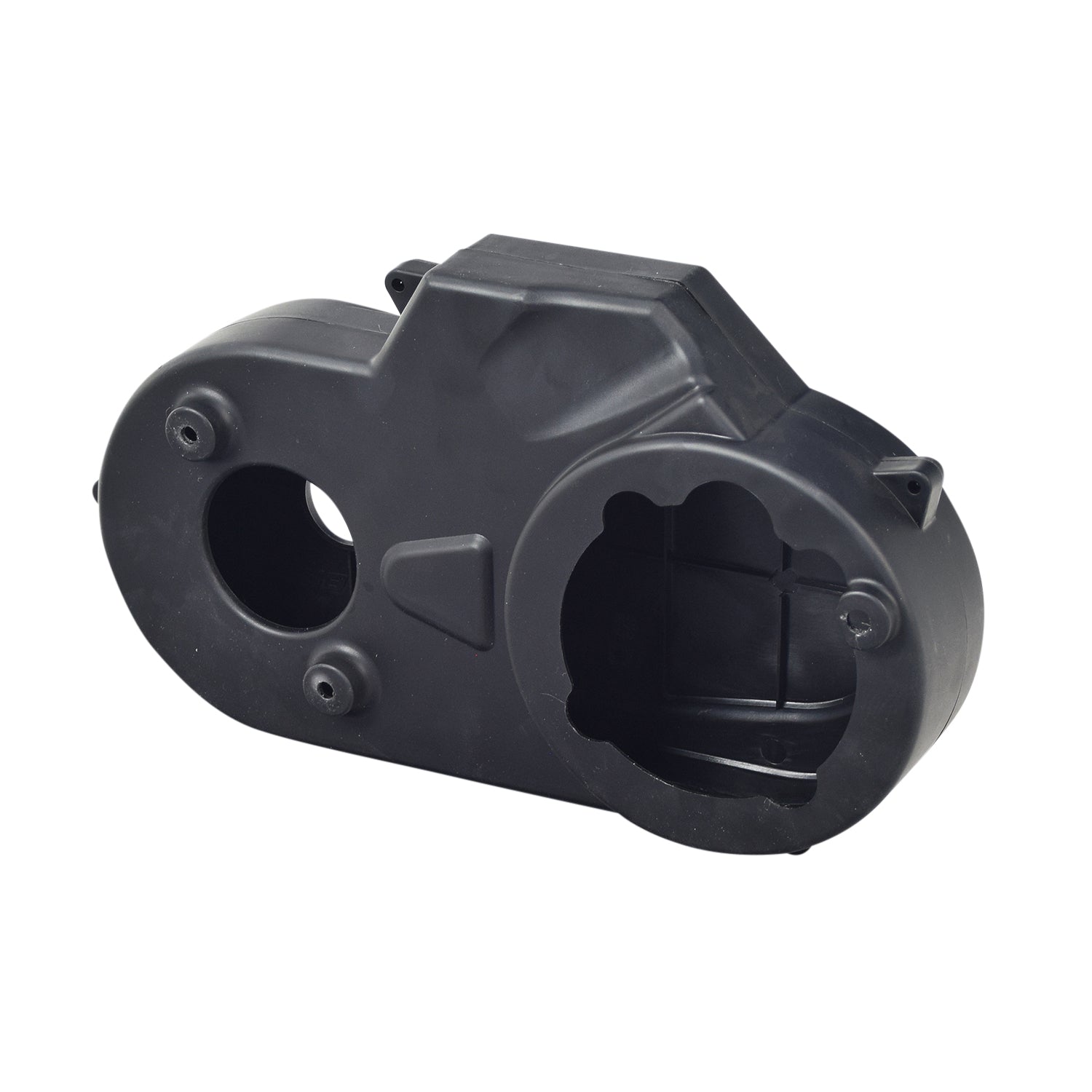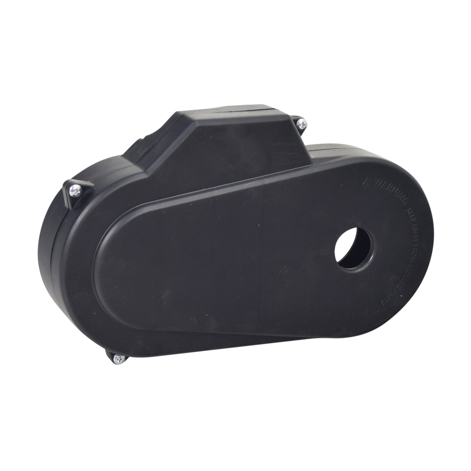 The black plastic chain guard for the Pulse ATV Quad Ride-On is a 2-part assembly that keeps the moving parts encased and protected from mud and twigs that might otherwise get caught in the chain and sprockets.