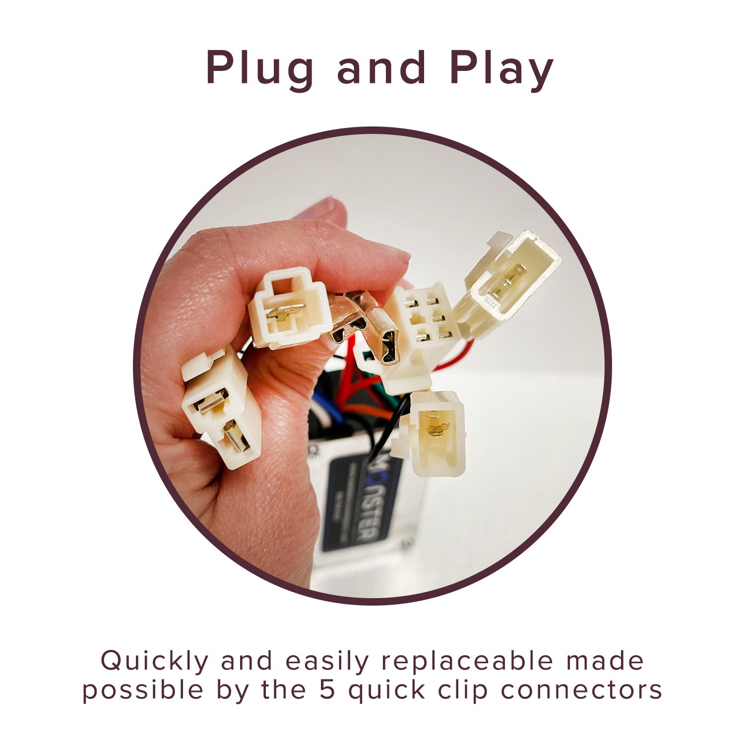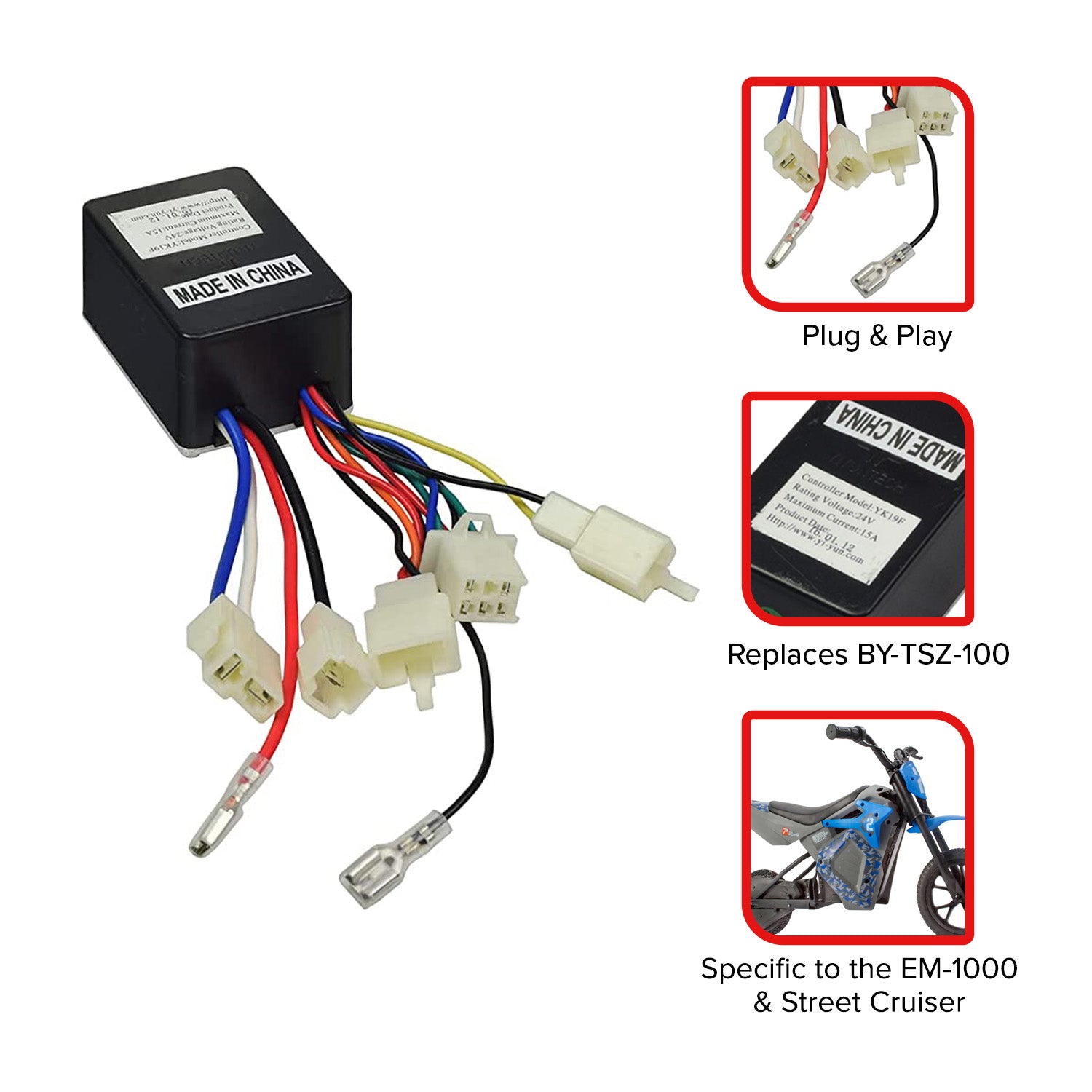 The 24 volt YK19D (YK19F) controller for the Pulse EM-1000 electric dirt bike is a replacement for the original BY-TSZ-100 controller. These offer a very easy "plug & play" installation on the Pulse EM-1000 and Street Cruiser.