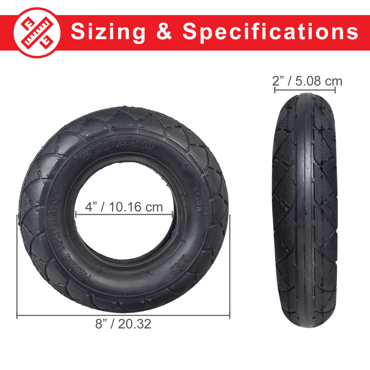 Here is a great scooter tire deal for you - our 200x50 (8"x2") scooter tire and inner tube set. Most commonly referred to as 200x50 due to its size in millimeters, this ubiquitous scooter tire is also called an 8"x2" tire. Fitting many scooter brands, this must be one of the most ridden on loops of rubber in the whole history of recreational scooters.