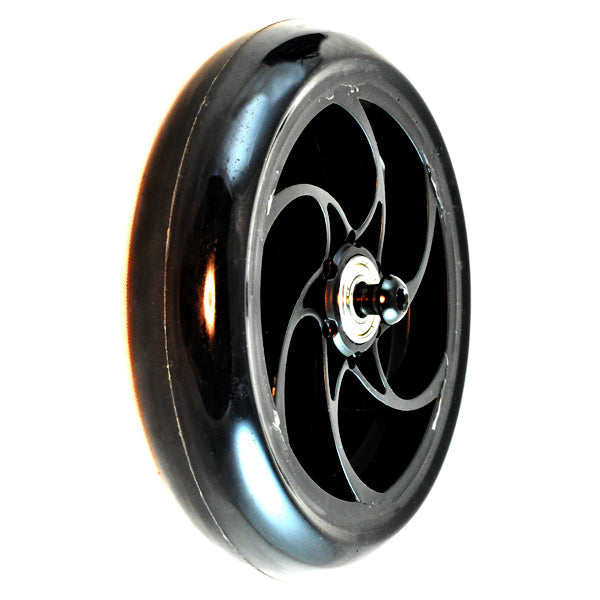 Our front wheel assembly for the Pulse electric scooters. This includes the black tire, a black plastic rim, and the 608ZZ bearings. Approximately 5-1/4" in diameter.