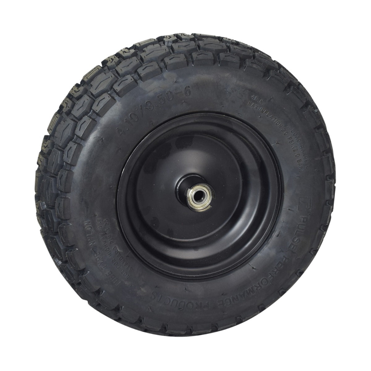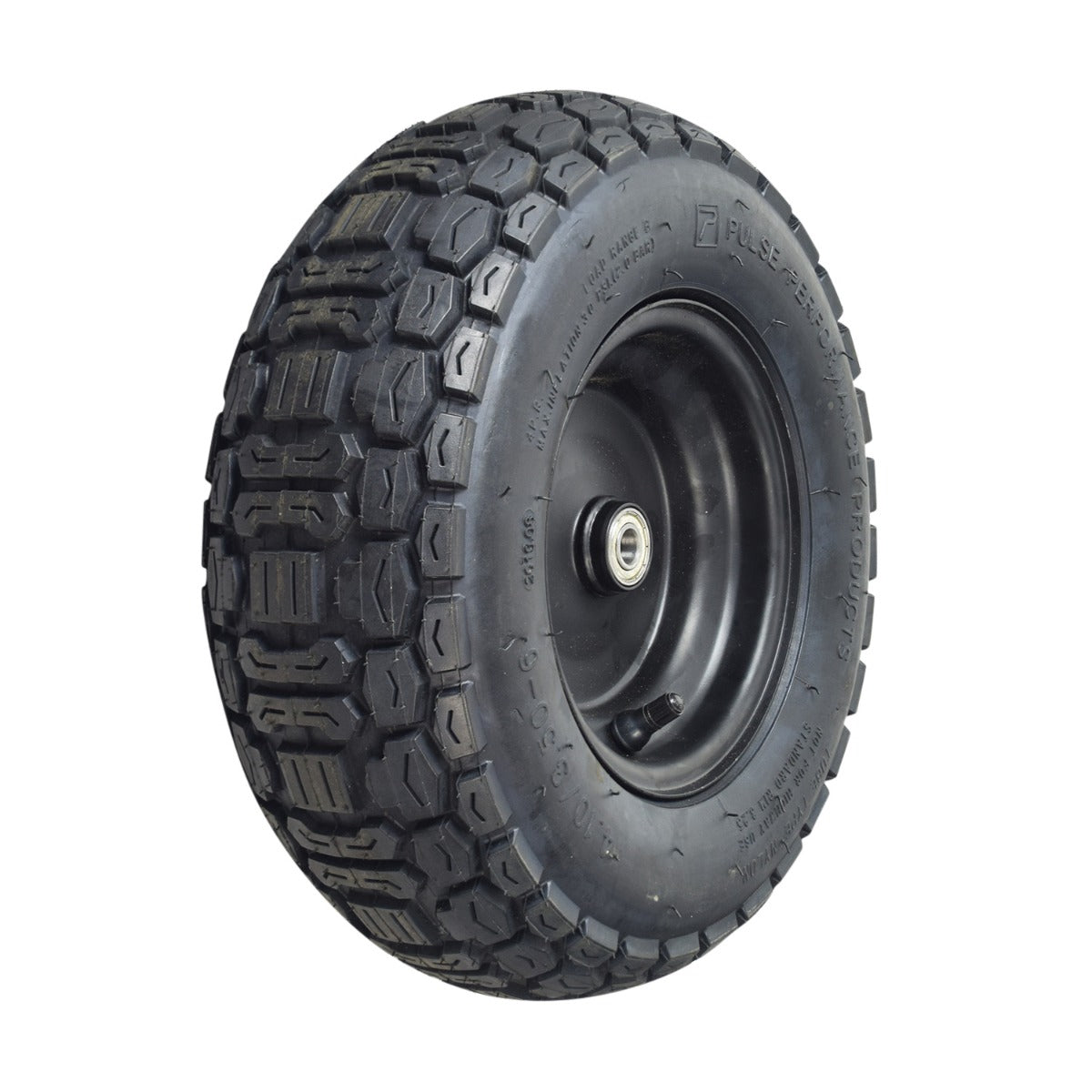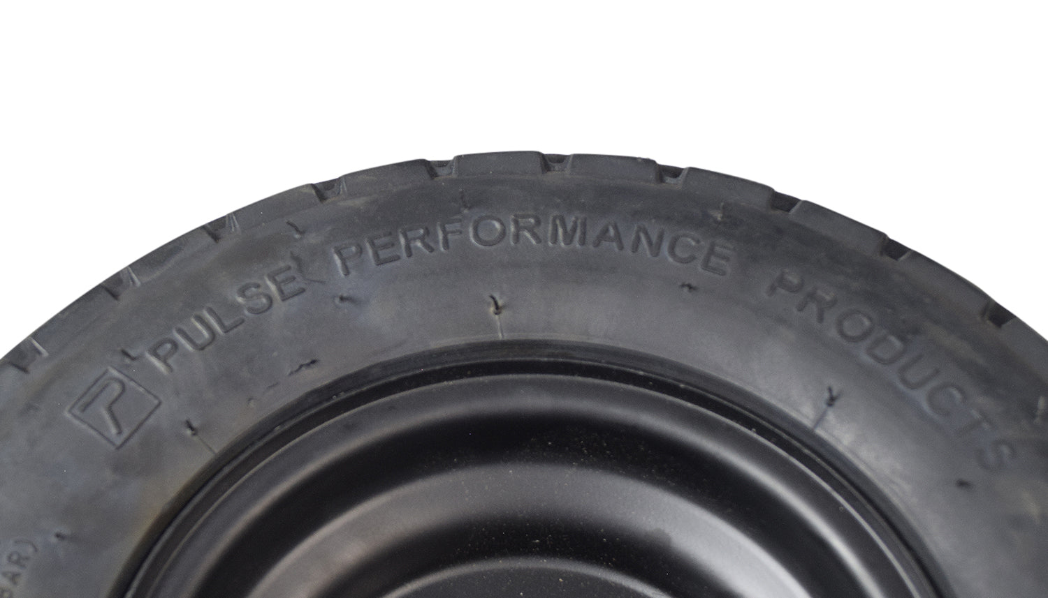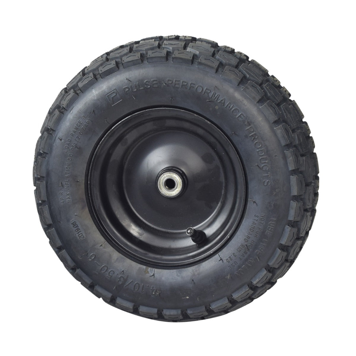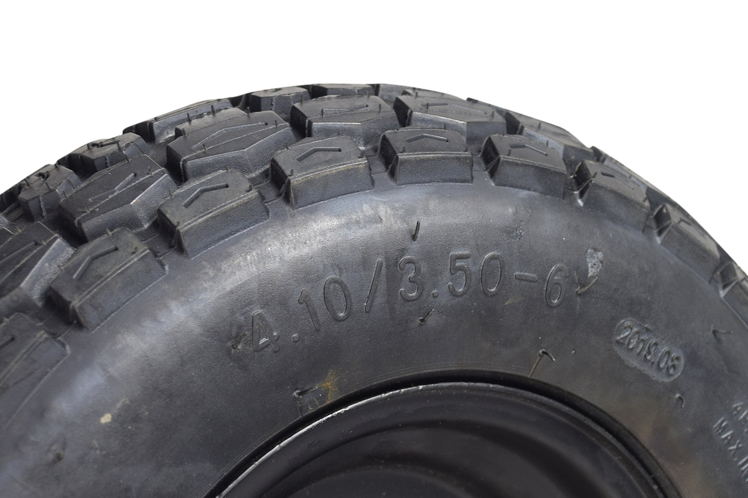 Also known as the drive wheel, the rear left wheel assembly for the Pulse ATV Quad Ride-On features a steel rim with bearings and a steel lock collar. A pneumatic 4.10/3.50-6 knobby tread and an inner tube with an angled valve stem make for some serious dirt-gripping traction.