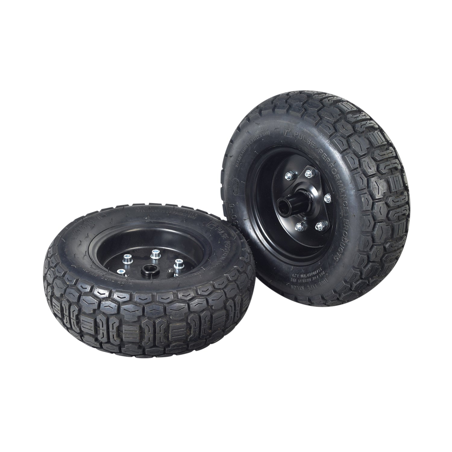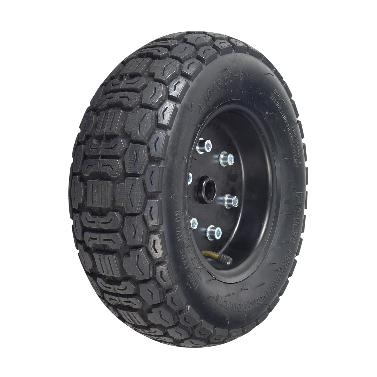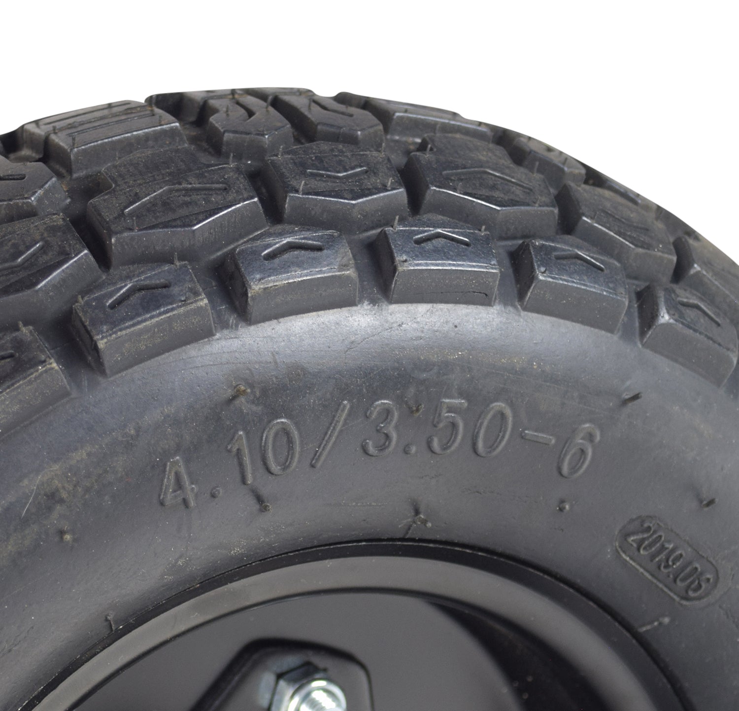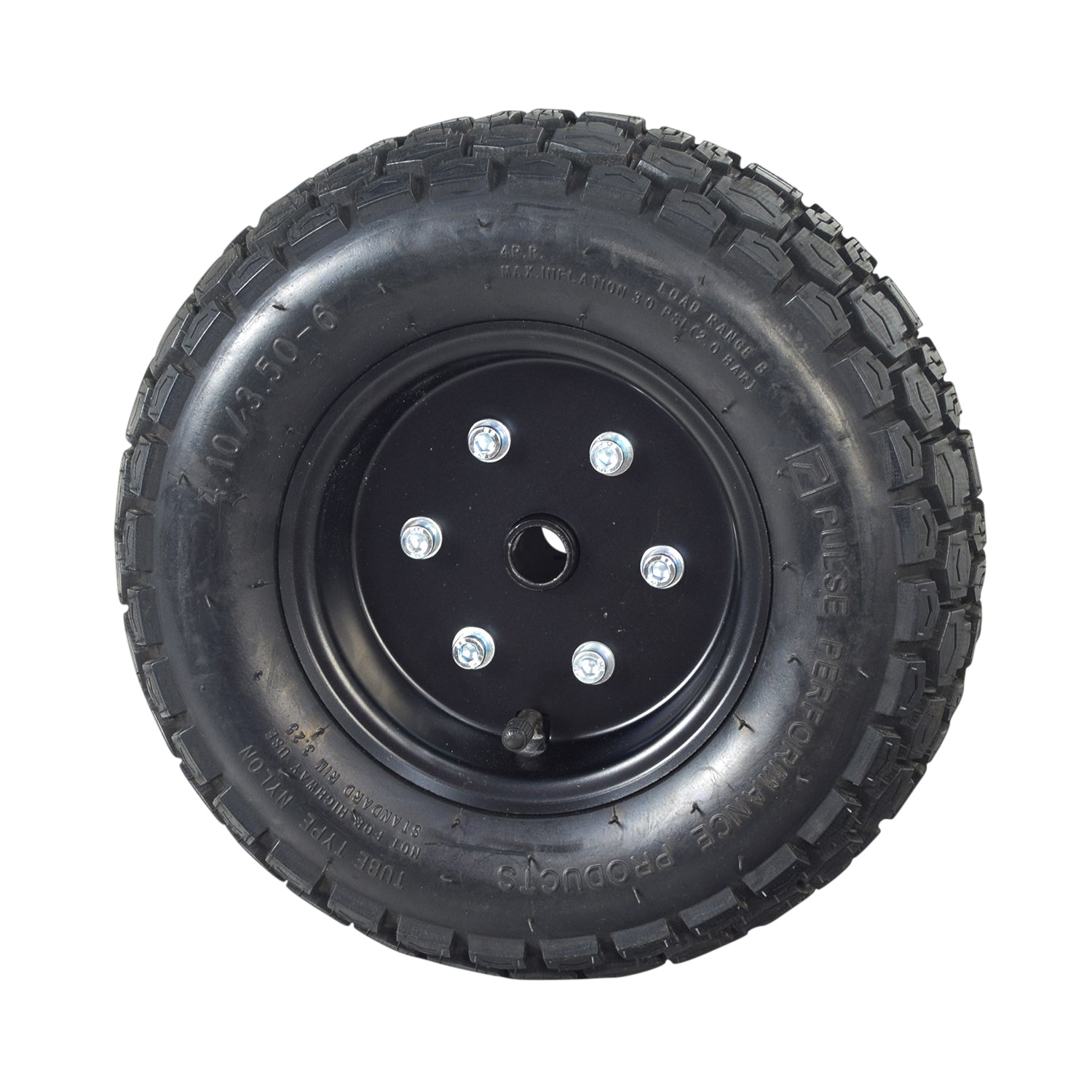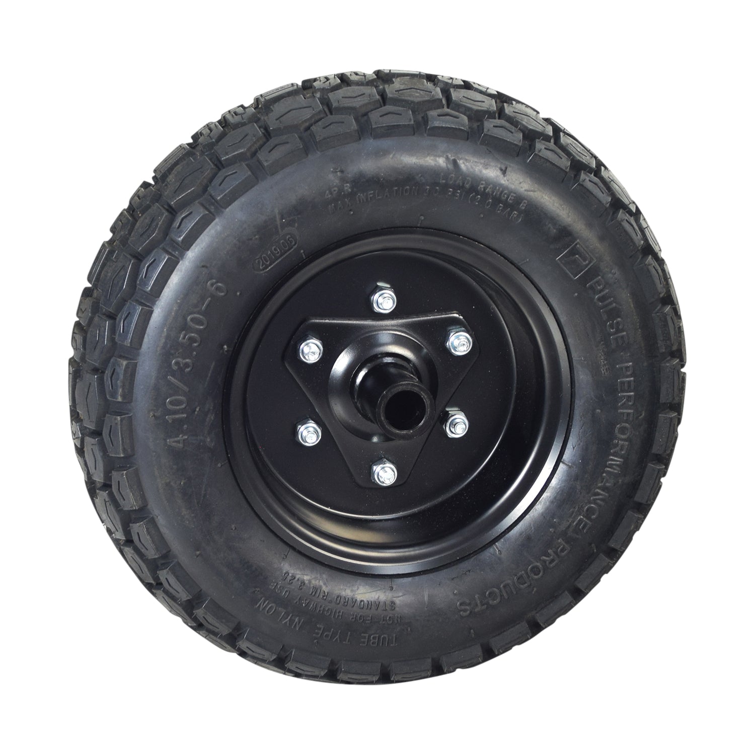 Also known as the drive wheel, the rear right wheel assembly for the Pulse ATV Quad Ride-On features a steel rim and front wheel hub with a 3/4" axle bore. A pneumatic 4.10/3.50-6 knobby tread and an inner tube with an angled valve stem make for some serious dirt-gripping traction.