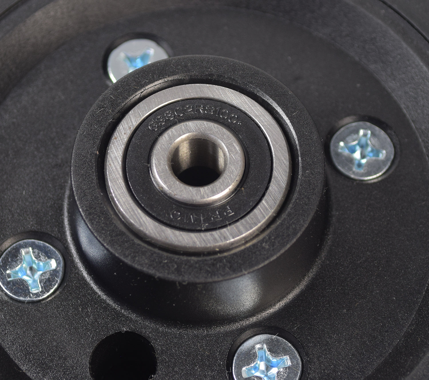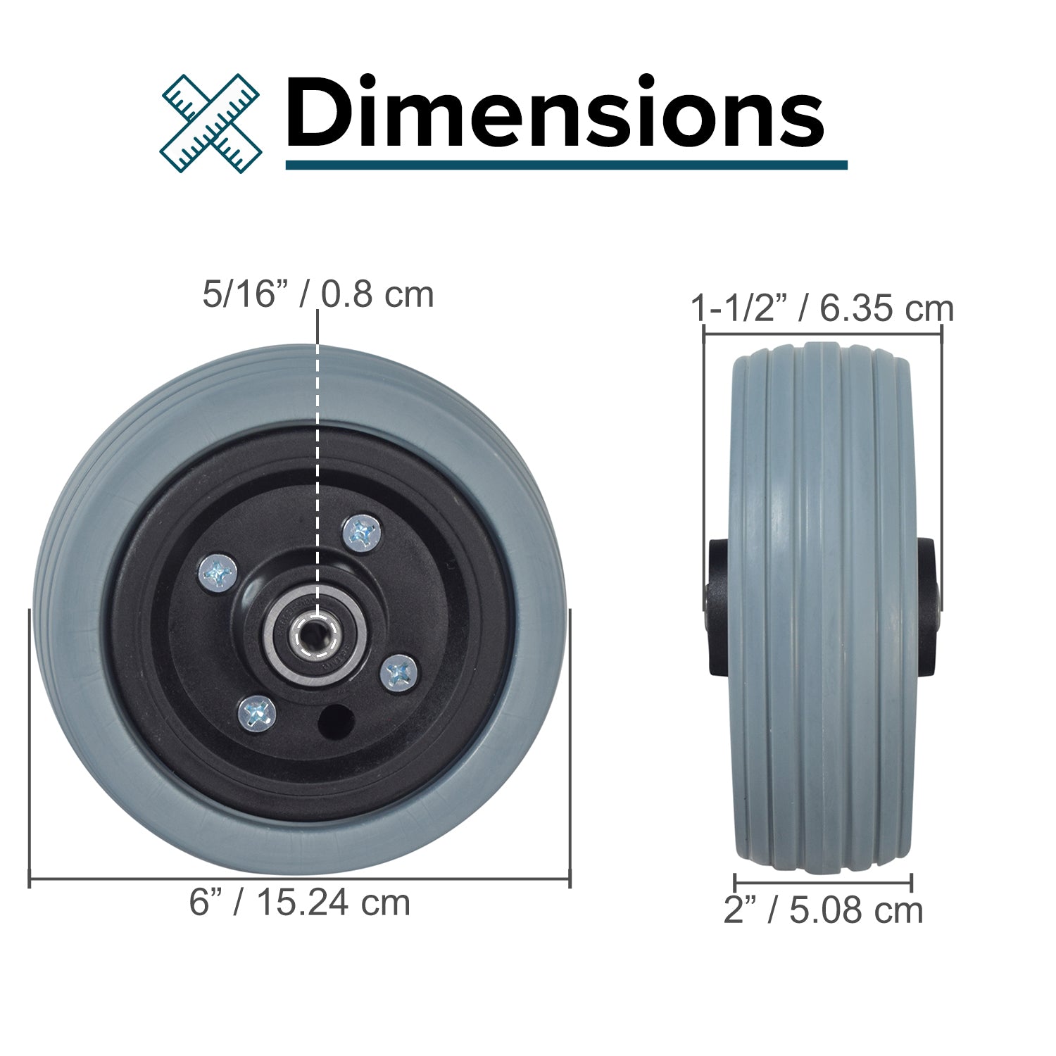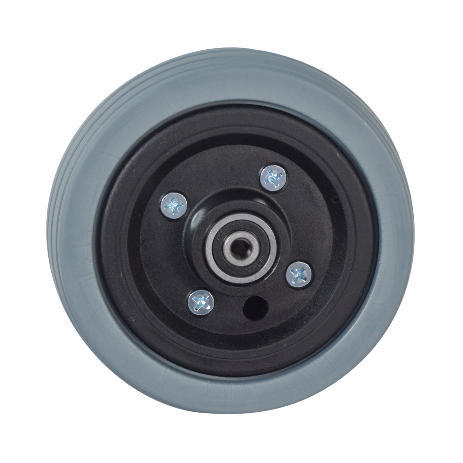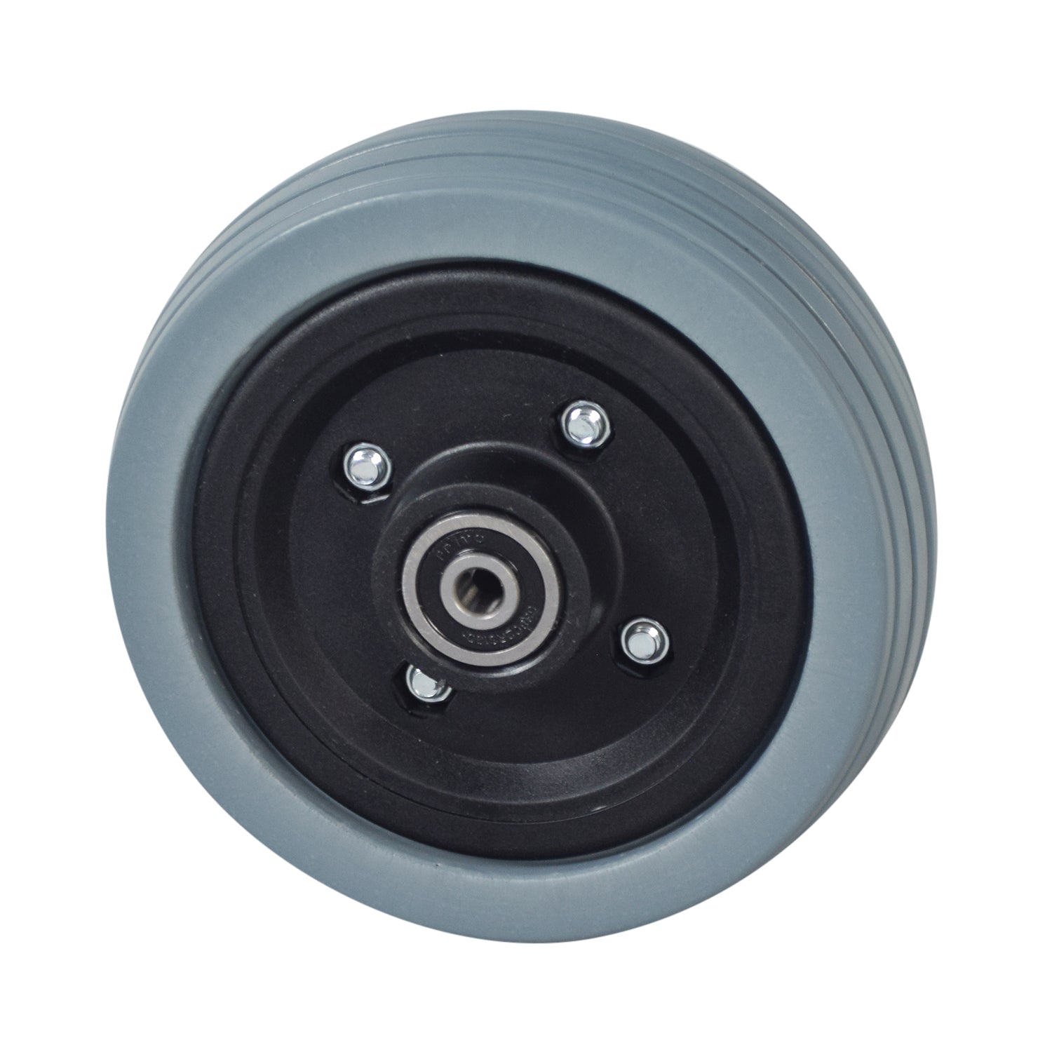 6"x2" flat free caster wheel assembly. Includes black rim, gray tire, bearings and spacer.