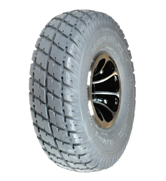 Our 10"x3" (3.00-4, 260x85) flat free drive wheel assembly, sports a gray tire, Durotrap tread, and a black hub. It works on a multiplicity of Jazzy models including the 610, 1103, Select, and a few more. In addition, this wheel is used on the J6. Please check the Compatibility tab to find your power chair model.