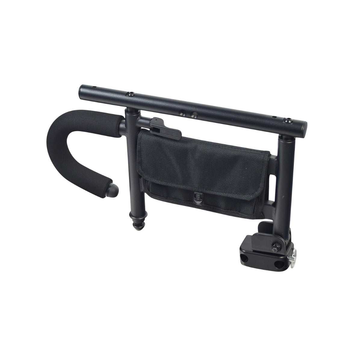 The 2-post flip-up armrest assembly for Quantum power chairs with Synergy or Tru-Balance power positioning seats is available in either a left-side or a right-side configuration. These armrest assemblies feature a full length 14" black waterfall armrest pad, a height adjustable upper armrest, the 2-post lower armrest, latch block, and the necessary hardware.
