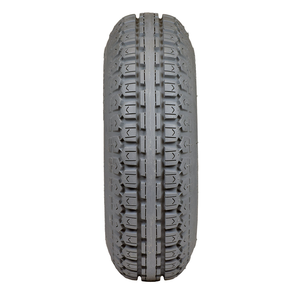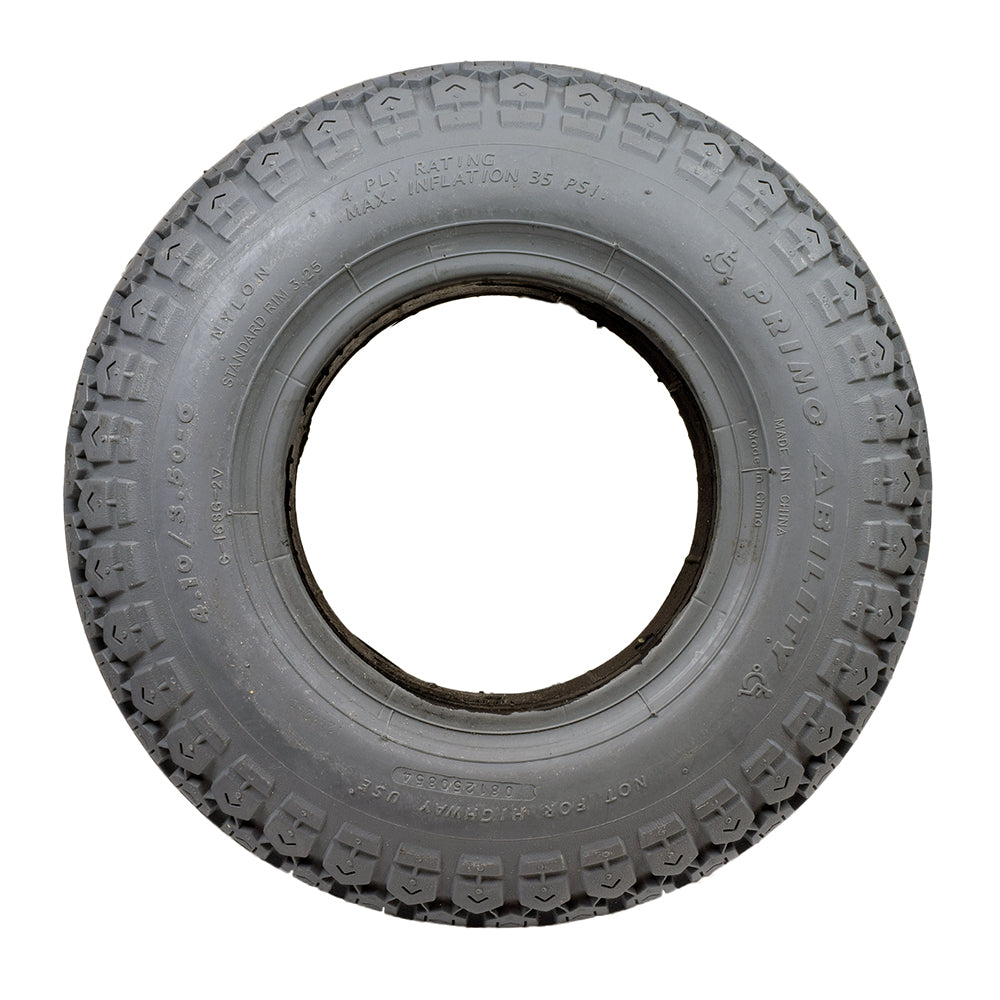 The 4.10/3.50-6 foam-filled solid flat-free mobility tire with a C168G Knobby tread pattern fits many mobility scooters and power chairs. This latex-free, non-marking gray rubber mobility tire is manufactured by Primo.