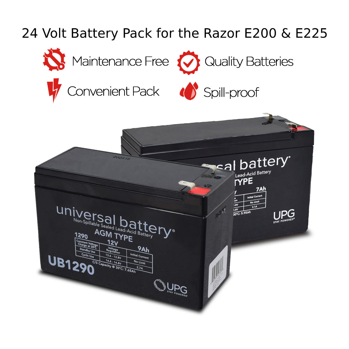The Razor E200/E225 was made in both a red & silver colored belt drive, and a green colored chain drive version. Both were popular values in electric scooters. Our equivalent 24 volt battery pack for the Razor E200 & Razor E225 is another very popular value in replacement scooter parts. For the low price listed above, you receive two new 12 Volt 7 Ah batteries with the wiring harness. Or you can upgrade your battery pack with our high capacity 12 Volt 9 Ah batteries for an increased runtime of 28%.