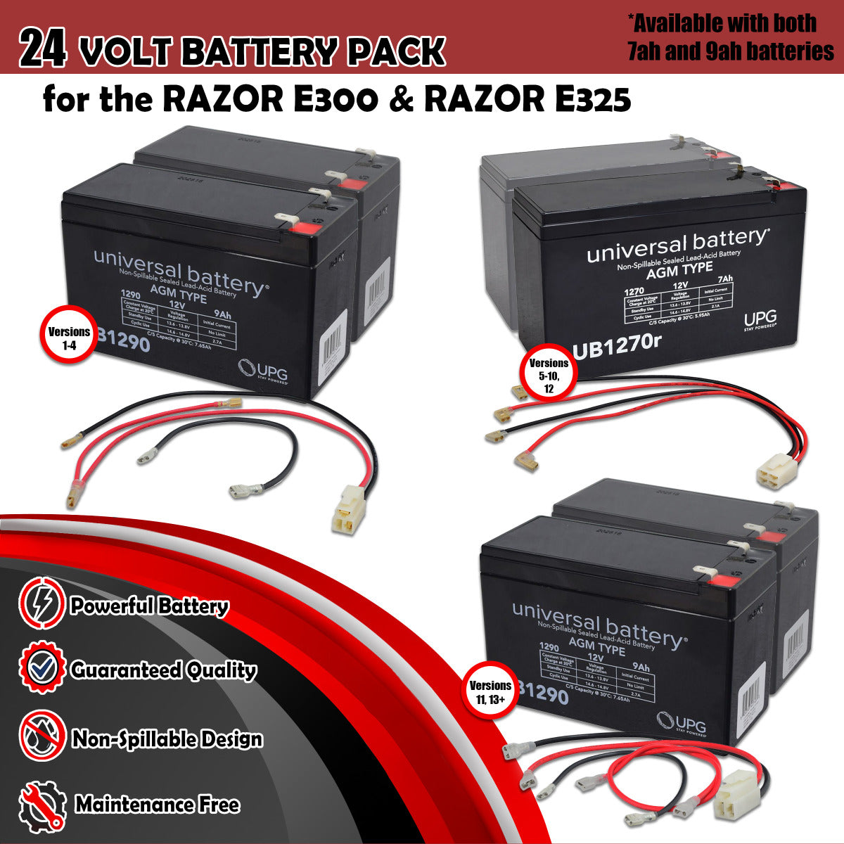With over 20 versions produced over the years, the mid-sized Razor E300/E325 series scooter has enjoyed a long and fruitful production run. You can celebrate your scooter's longevity with our equivalent 24 volt battery pack for the Razor E300 and Razor E325 models while saving money. For the low price listed above, you will receive two new 12 Volt 7 Ah batteries. Or you can upgrade your battery pack to a pair of 12 Volt 9 Ah batteries, giving your scooter an increased runtime of up to 28%.