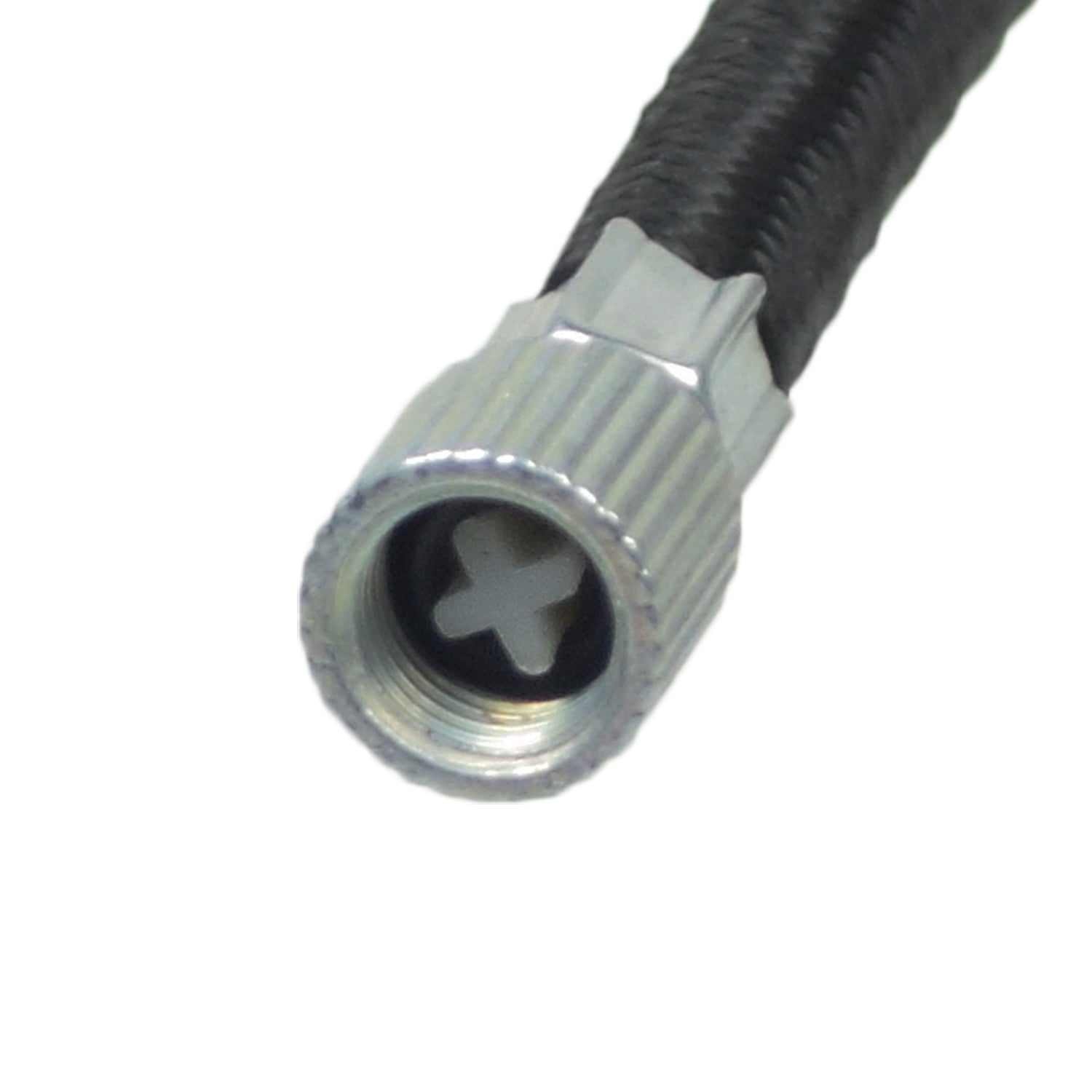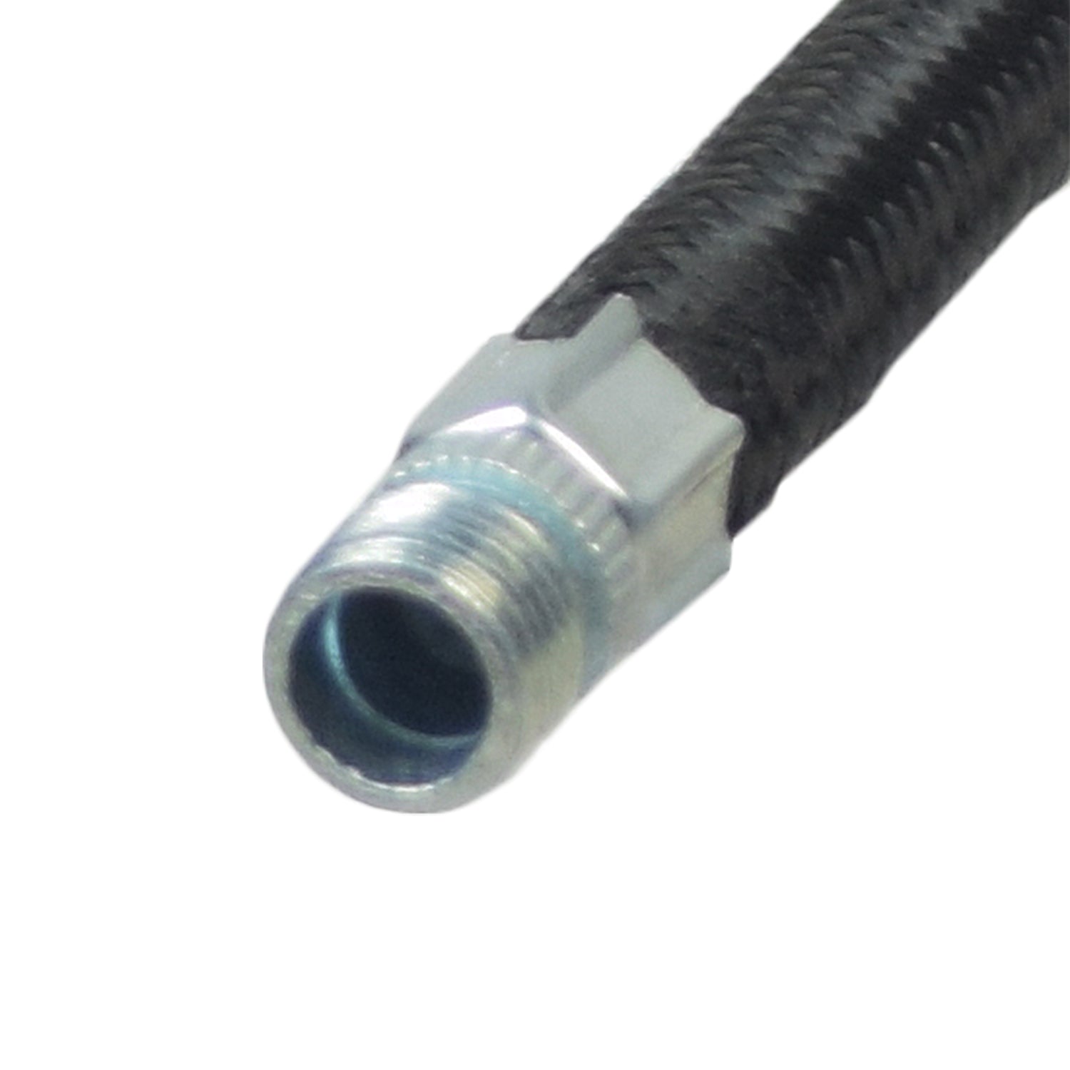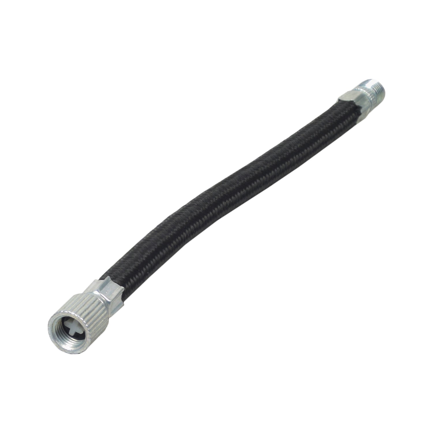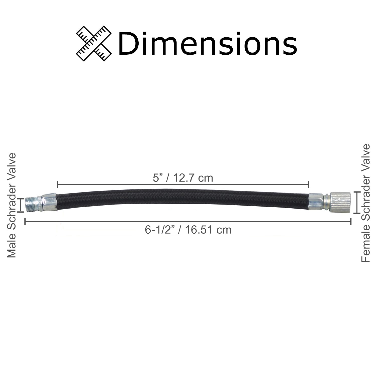 The extender features an overall length of 6-1/2" and 5" of black braided nylon to protect the internal rubber tube. One end sports a male Schrader valve connector and the other end is female.