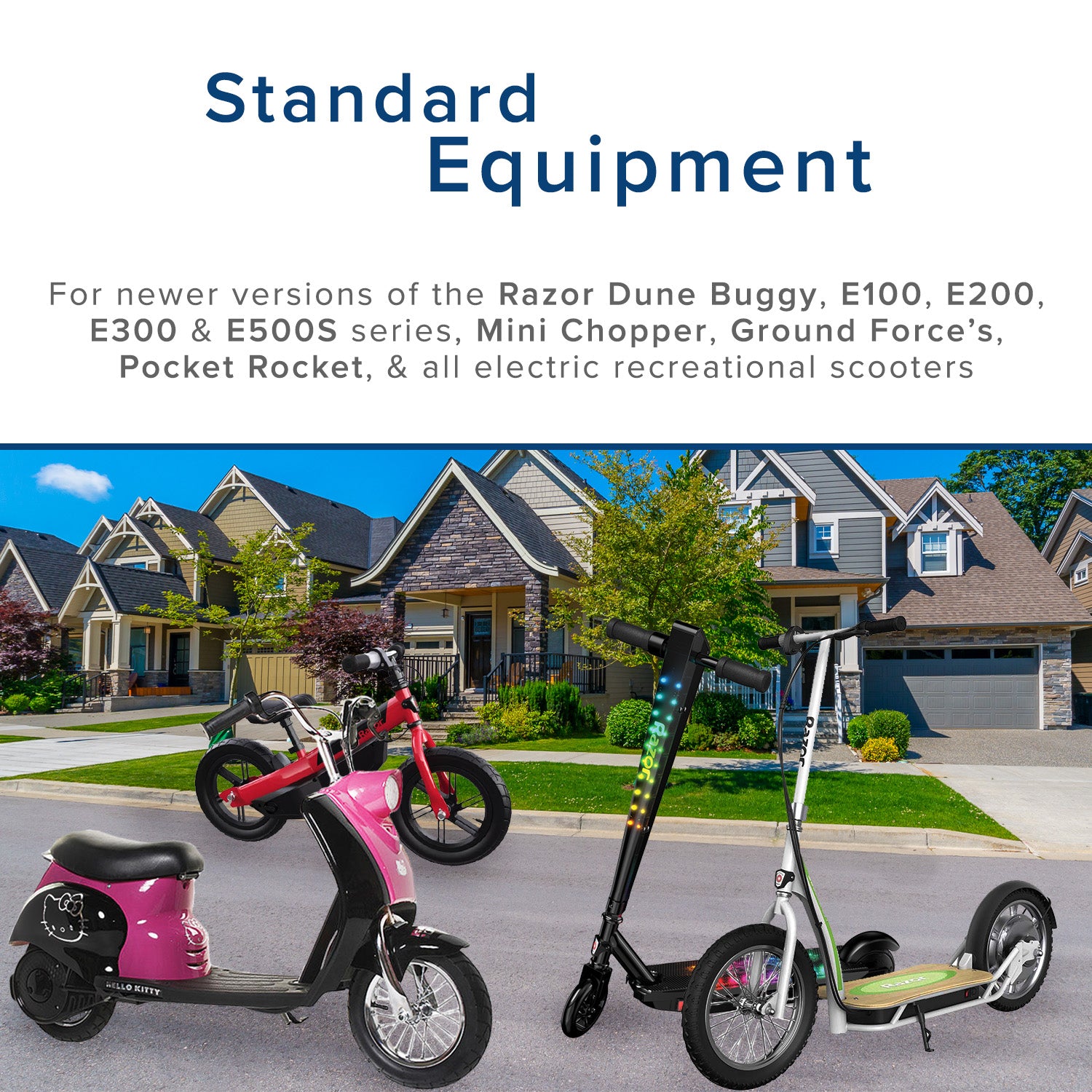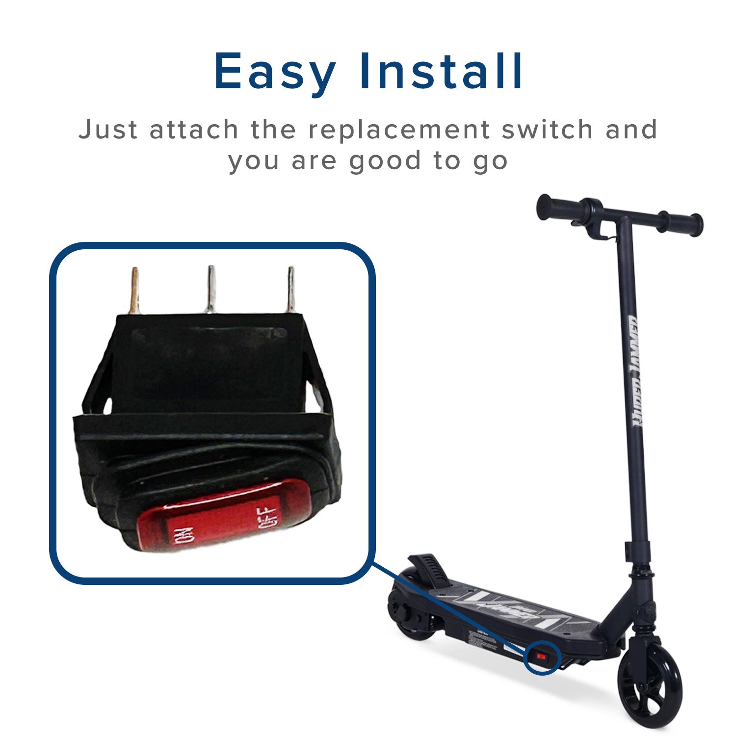 This switch is now standard equipment for newer versions of the Razor Dune Buggy, E100 series, E200 series, E300 series, E500S, Mini Chopper, Ground Force, Ground Force Drifter, Ground Force Drifter Fury (GFD Fury), Pocket Rocket, and other electric recreational scooters made by Razor but can also be used as a replacement for many other similar on/off switches.
