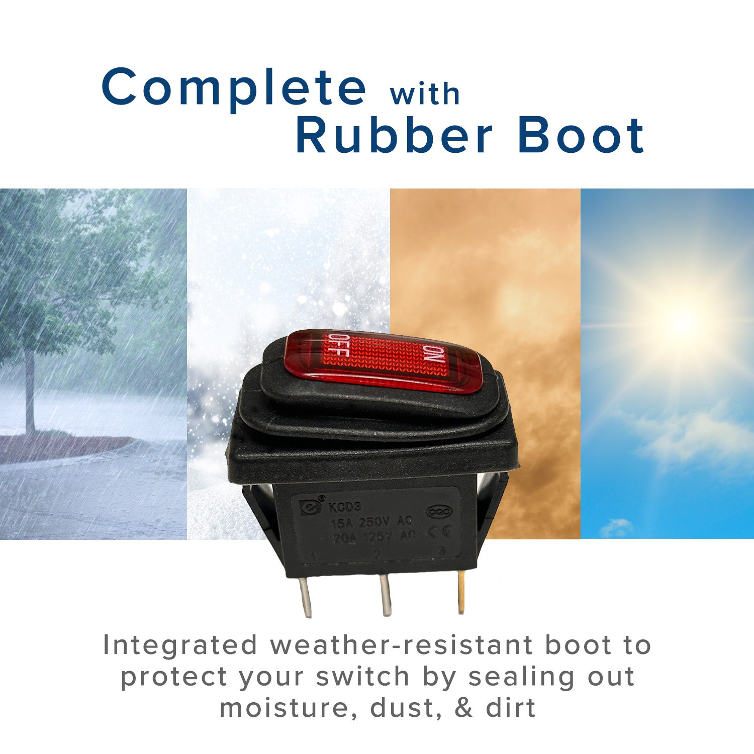 Here is the latest version of the red on/off switch, now with an integrated weather-resistant rubber boot to protect your switch with from the elements.
