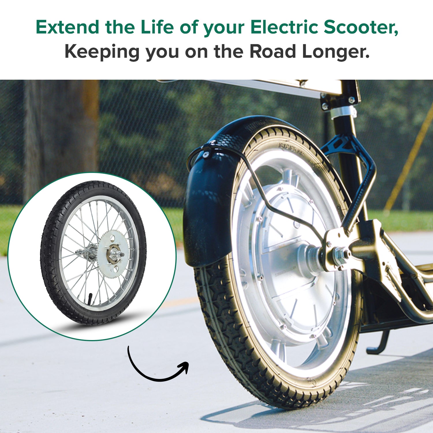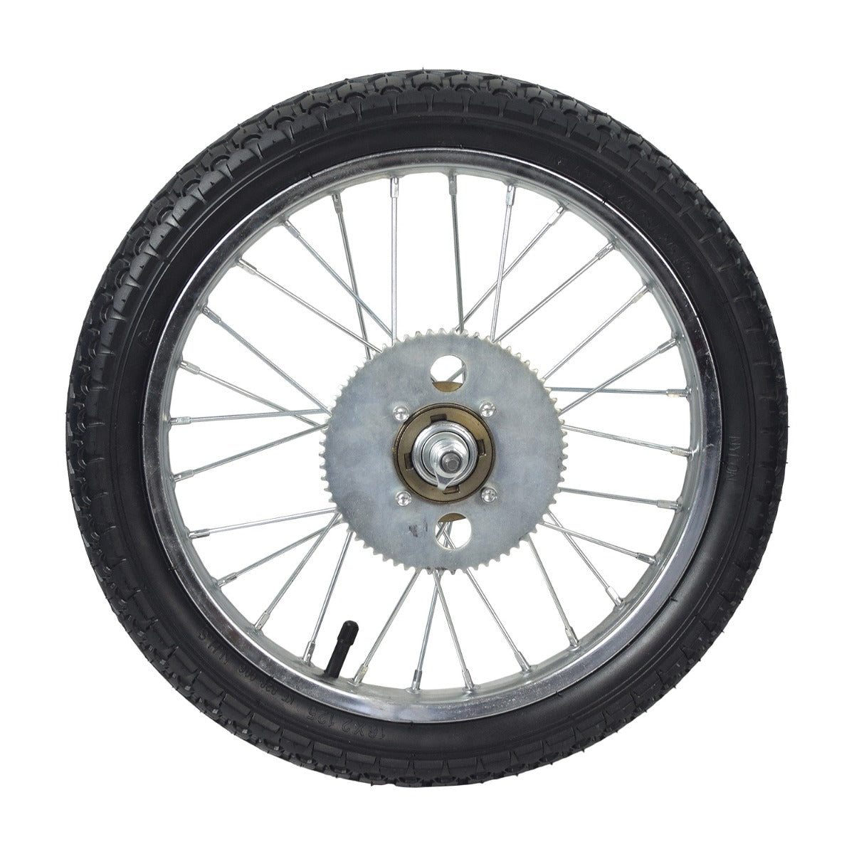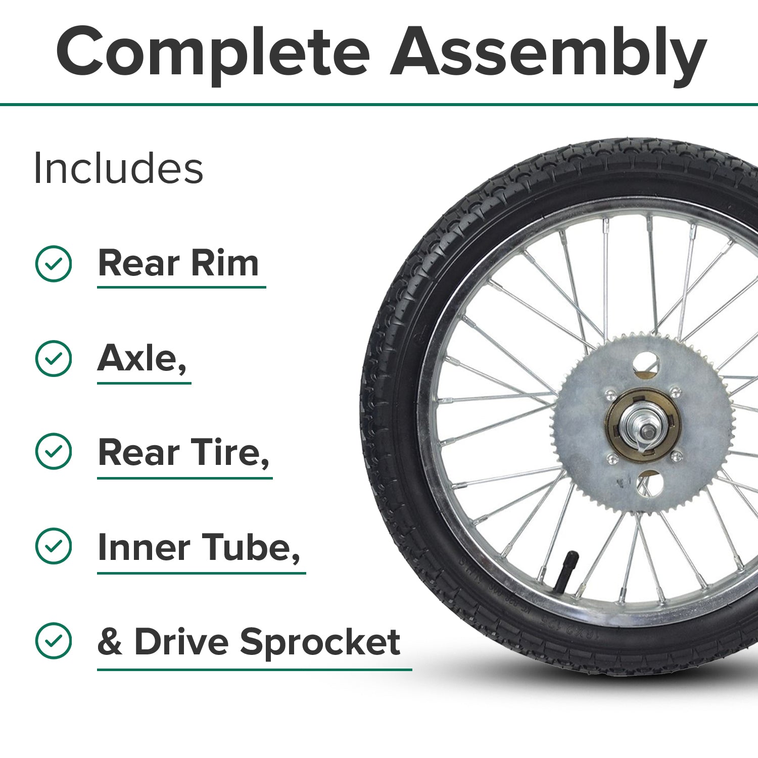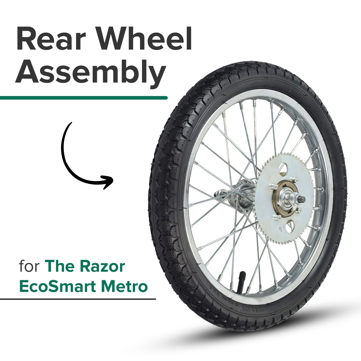 Complete rear wheel assembly for the Razor EcoSmart Metro electric scooter. This wheel assembly includes the rear rim, axle, rear tire, inner tube, and drive sprocket.