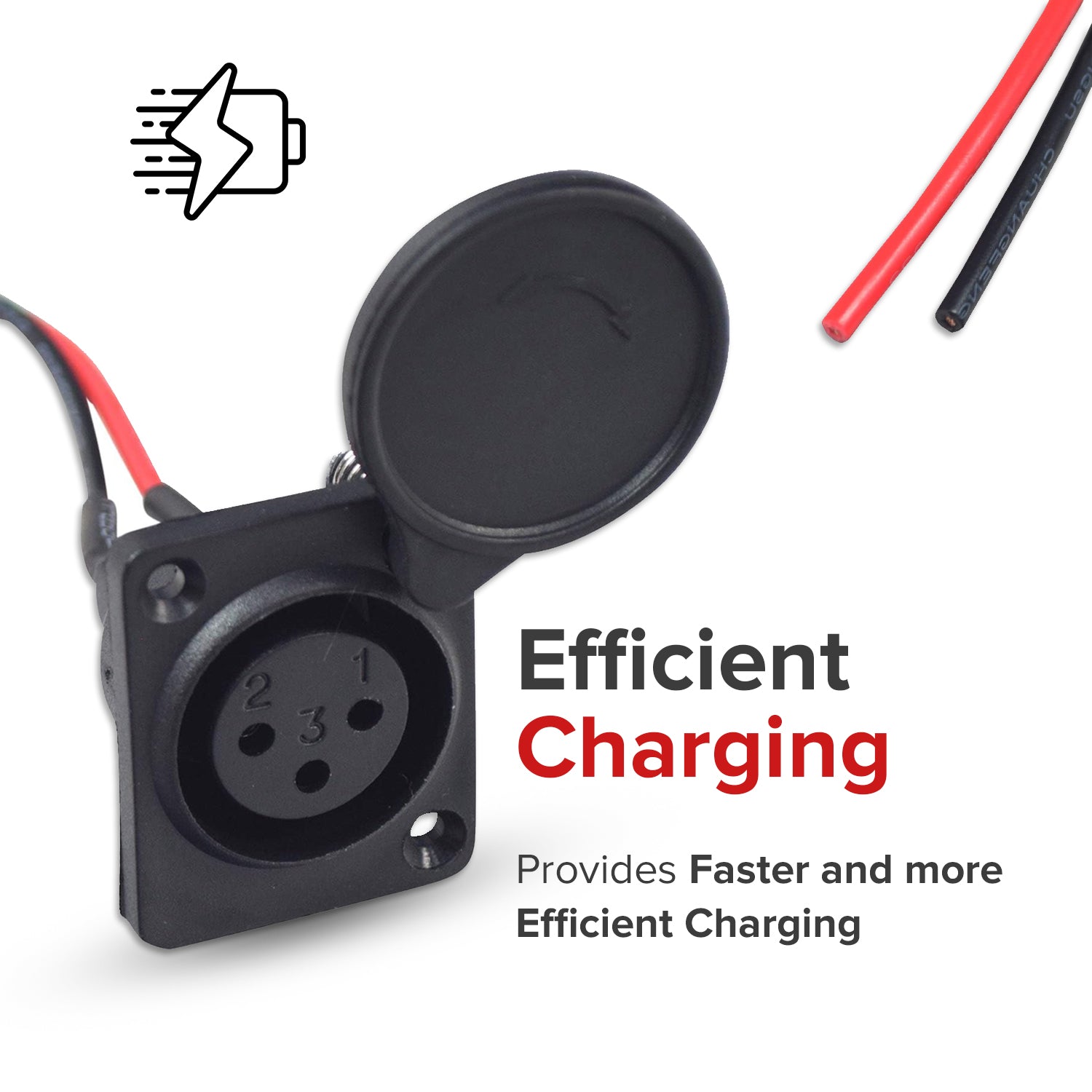This XLR charger port connects your battery directly to your charger. It has two wires which lead into the two connector ends. Please note that the connectors may be different than the ones that were on the original port and so a little cutting and splicing may be required.
