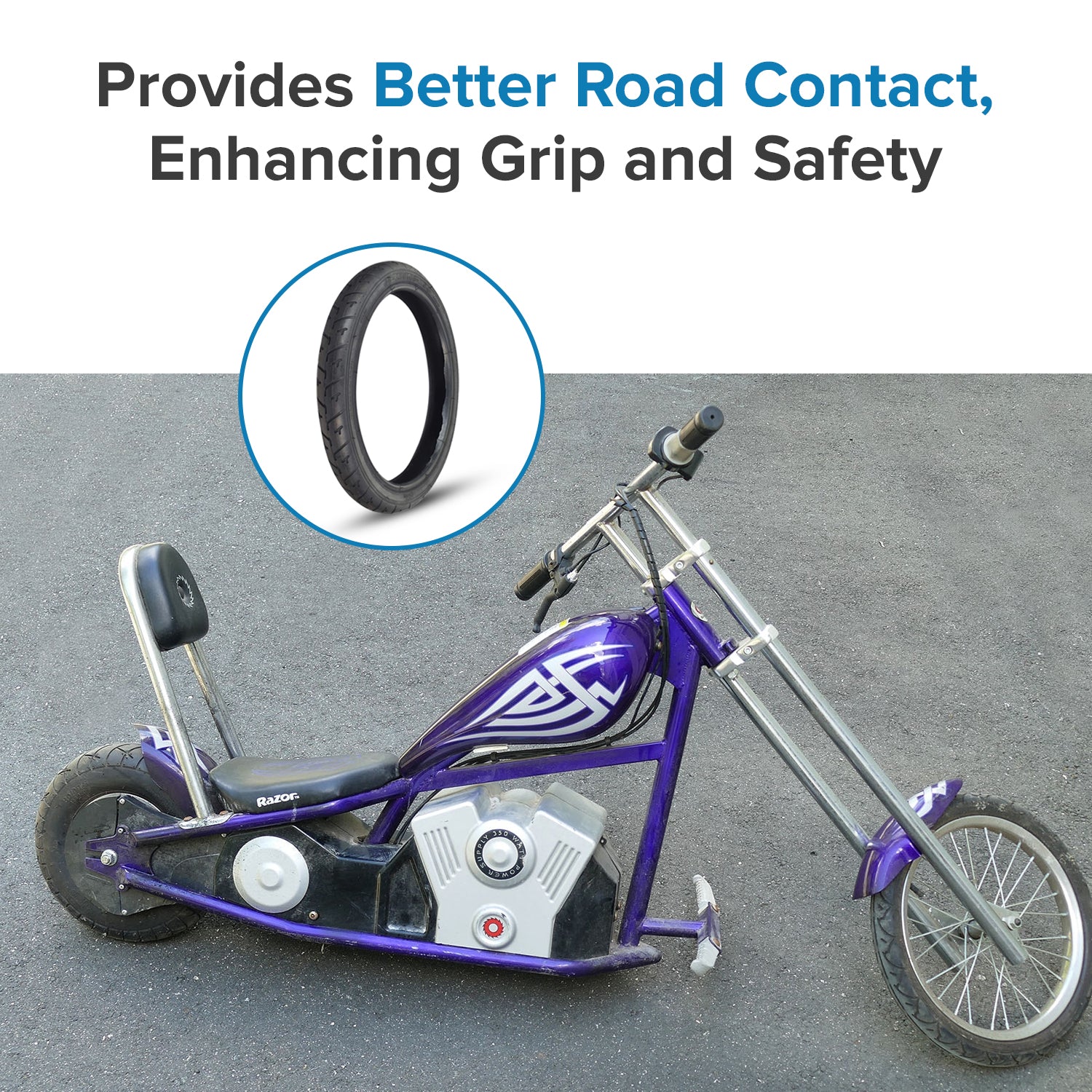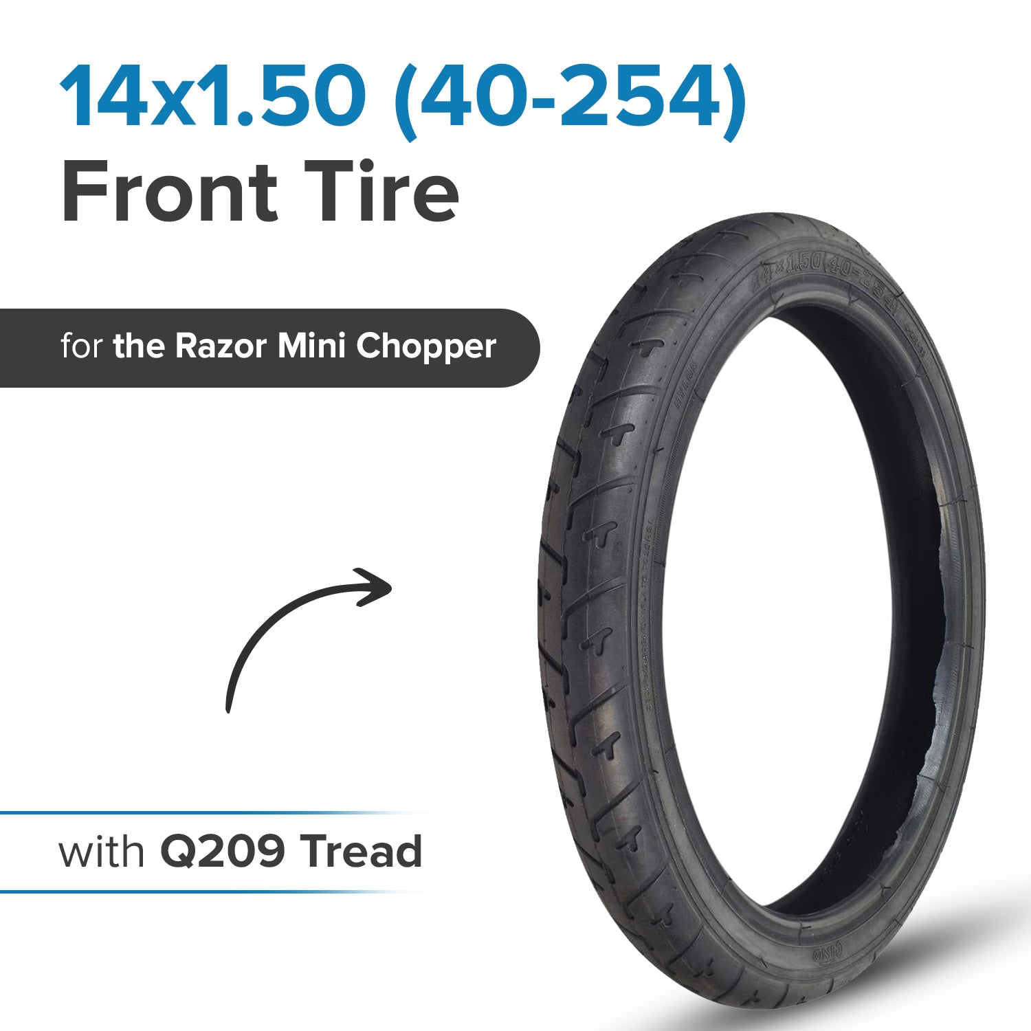 Our 14"x1.50" (40-254 )front tire with Q209 tread is used on the front rim of the Razor Mini Chopper. This is a quality Qind brand tire with a shallow siped (shallow groove) tread pattern. If your front Razor Mini Chopper tire is worn and needs to be replaced, this is the tire for you.