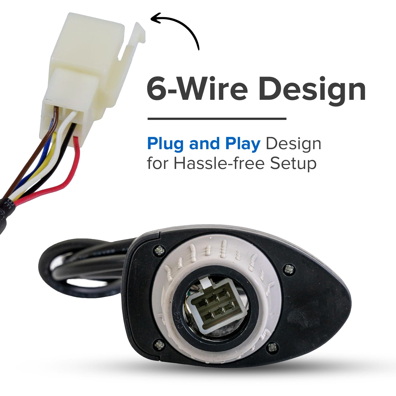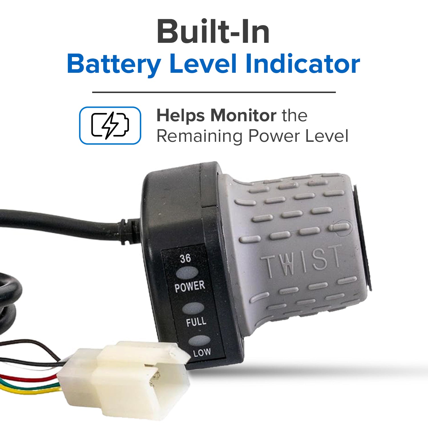 This brand new OEM Razor twist grip throttle has 6 wires with a single plastic connector. A built-in battery level indicator helps monitor the remaining power level of your scooter. Installation on compatible Razor scooters is a simple "plug and play" procedure.
