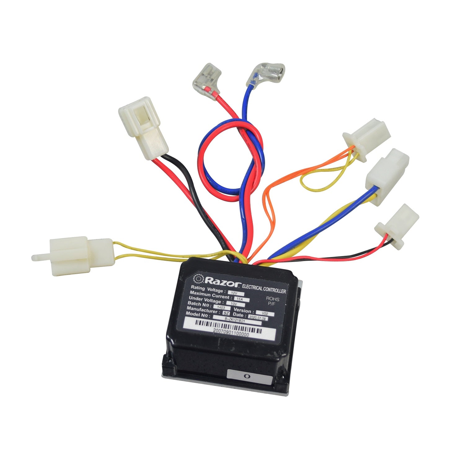 Our B-ZK1218D control module for the Razor MX125 Dirt Rocket dirt bike (V1-V5) and Pocket Mod Petite scooter has 7 connectors and is a direct replacement for the original control module. This 12 volt control module (aka "controller") for the Razor MX125 Dirt Rocket dirt bike is just the part that you need to replace a faulty unit.