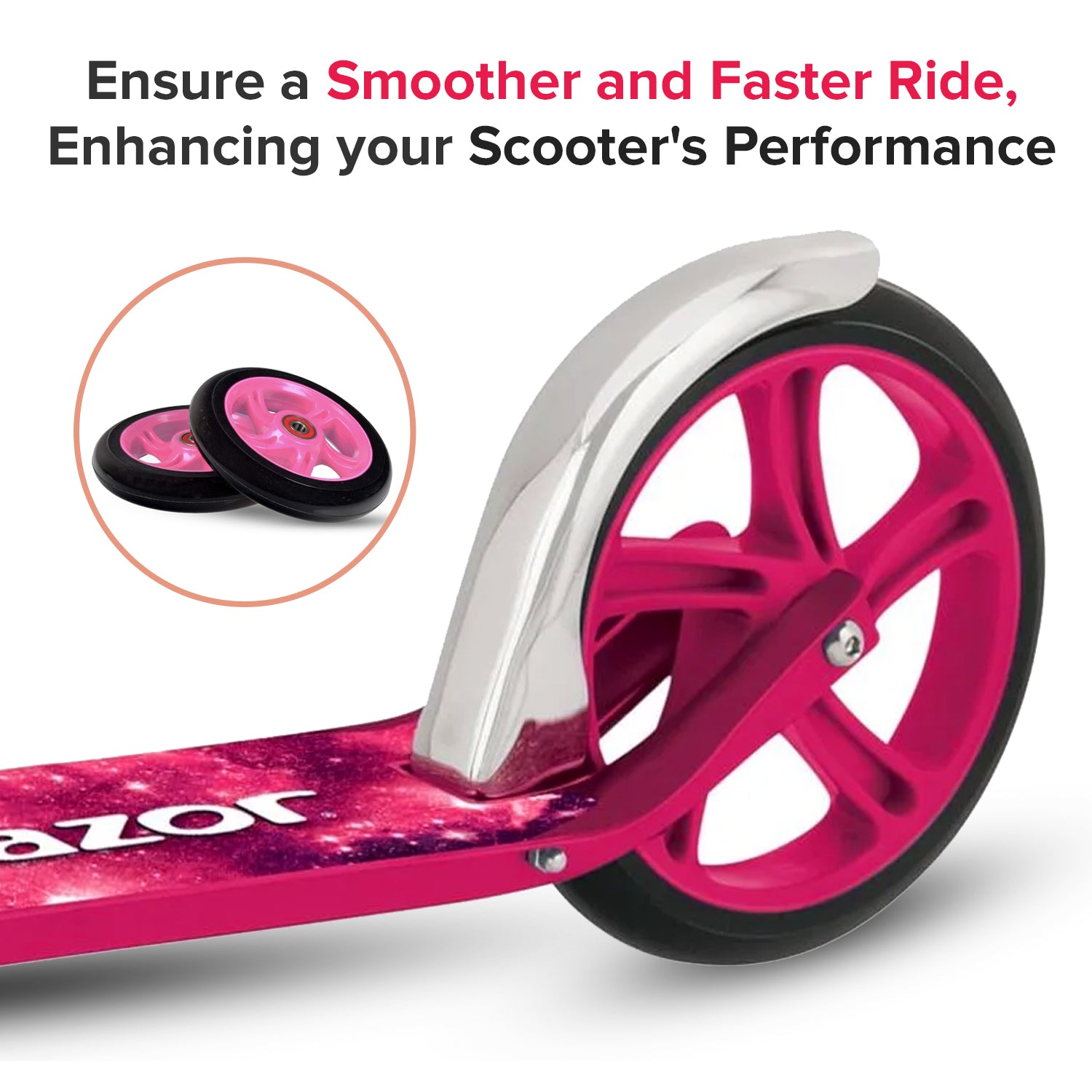A necessary Razor kick scooter part; 125 mm outer diameter Razor A3 kick scooter wheels with black wheels, pink hubs, and pre-installed 608ZZ or 608-2RS ABEC-5 bearings. These wheels measure 125 mm in outer diameter.
