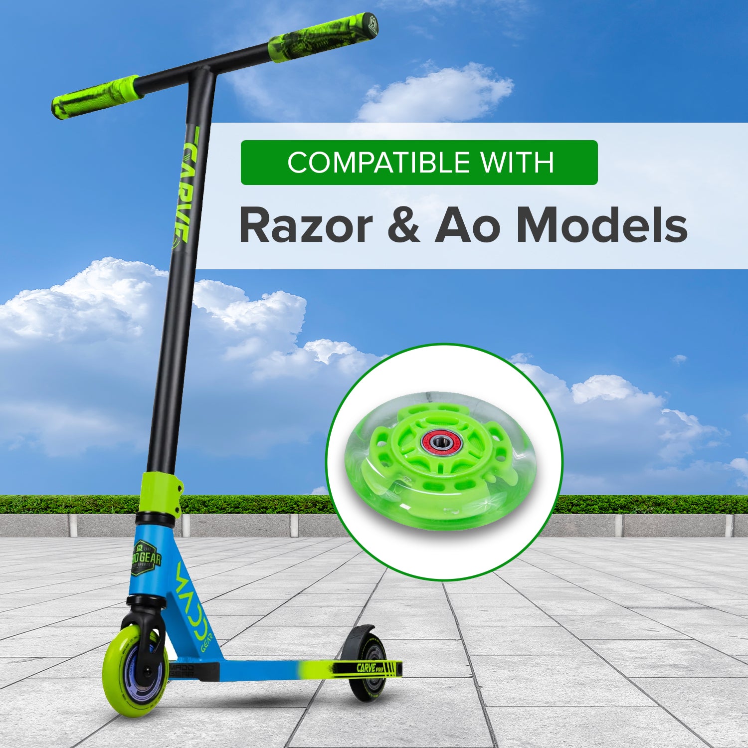 They look especially good on the popular Razor A and A2 kick scooters, but they can be a retrofit replacement on just about any scooter brand from Fuzion, Micro, Yvolution and many others. You can use these wheels on just about any kick scooter that rolls along on 98 mm or 100 mm wheels.